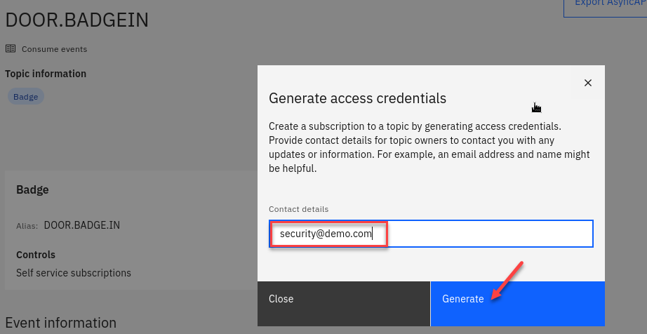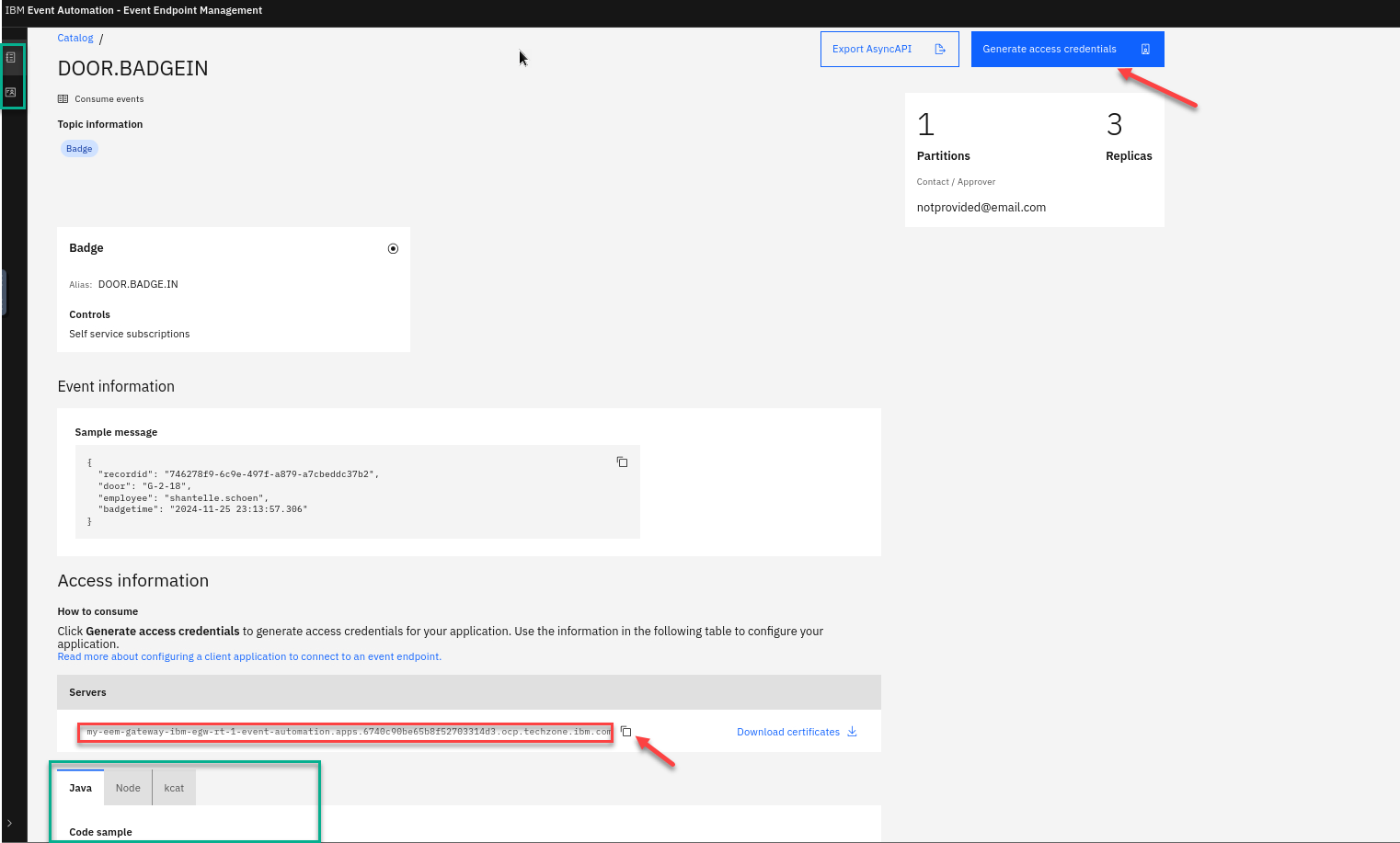 Go to the Event Endpoint Management catalog home page and find the DOOR.BADGE.IN topic.