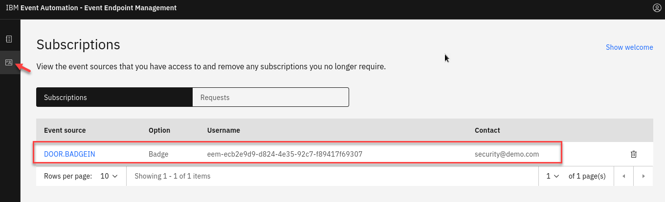 Event Endpoint Management provides the capability to describe and catalog your Kafka topics as event sources, and to share the details of the topics with application developers within the organization. Application developers can discover the event source and configure their applications to subscribe to the stream of events, providing self-service access to the message content from the event stream.