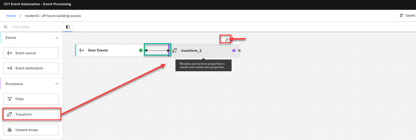 Click and drag from the small gray dot on the event source to the matching dot on the transform node.