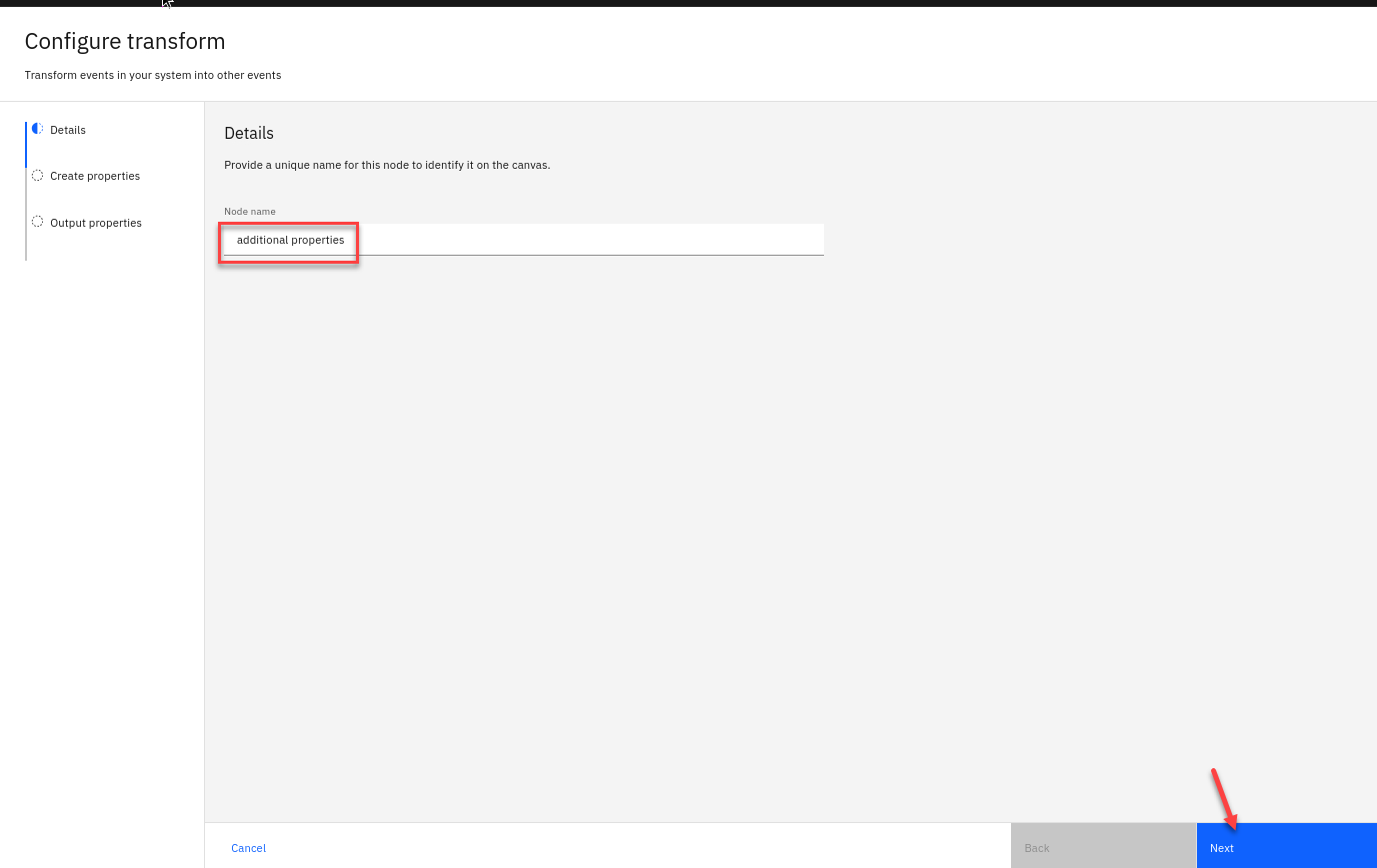 Give the transform node a name that describes what it will do: additional properties