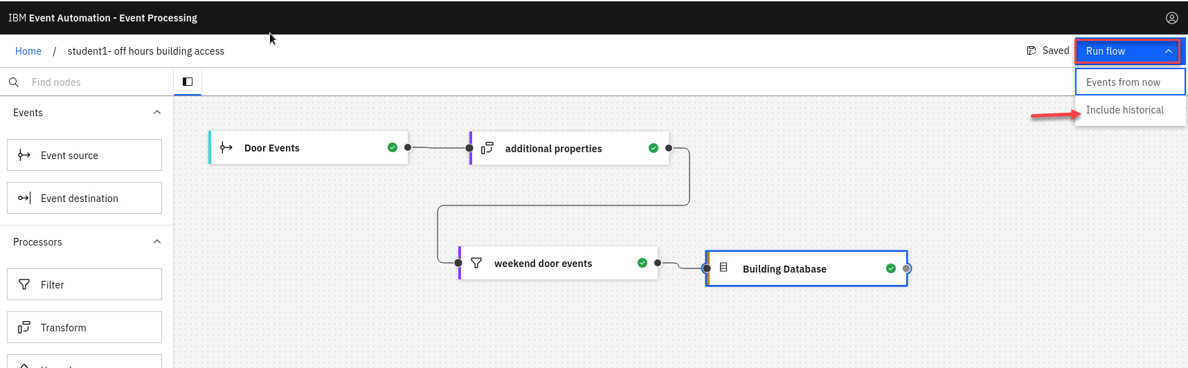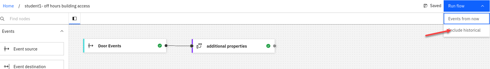 Use the Run menu, and select Include historical to run your filter on the history of door badge events available on this Kafka topic.