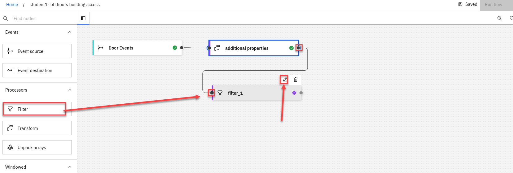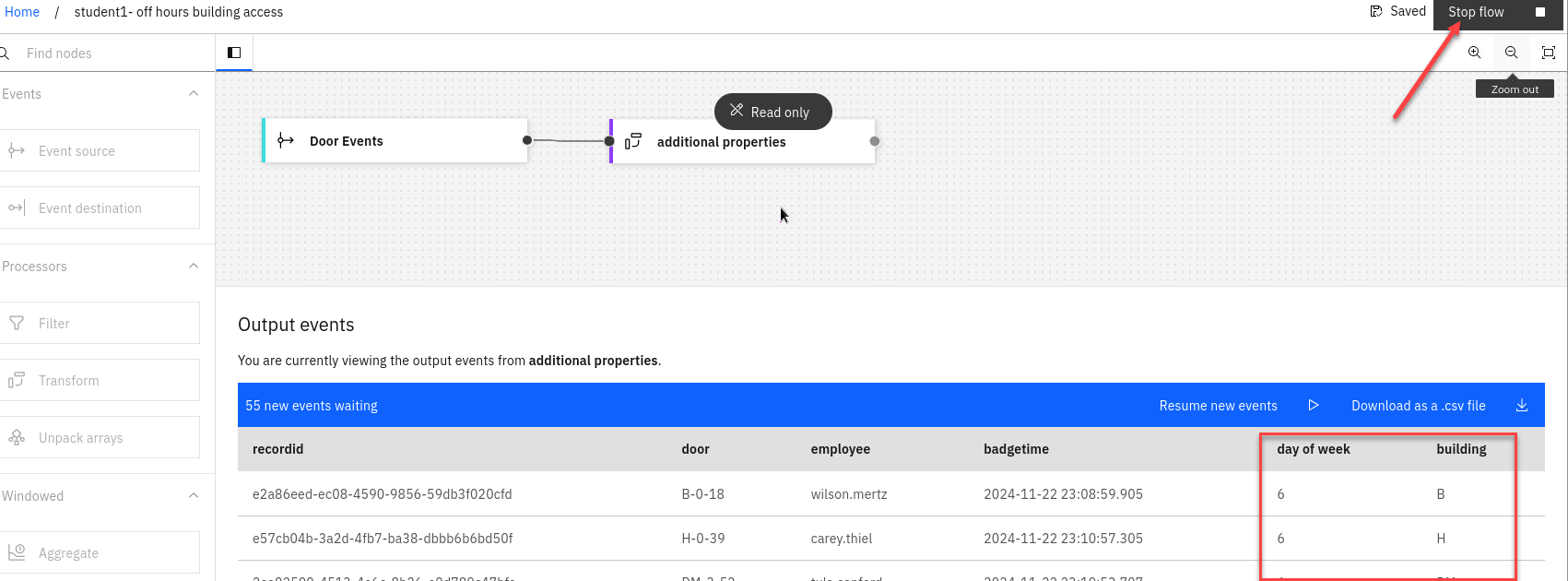 The next step is to identify door badge events that occur at weekends. The additional day of week property that you computed in the transform node will be helpful for this.