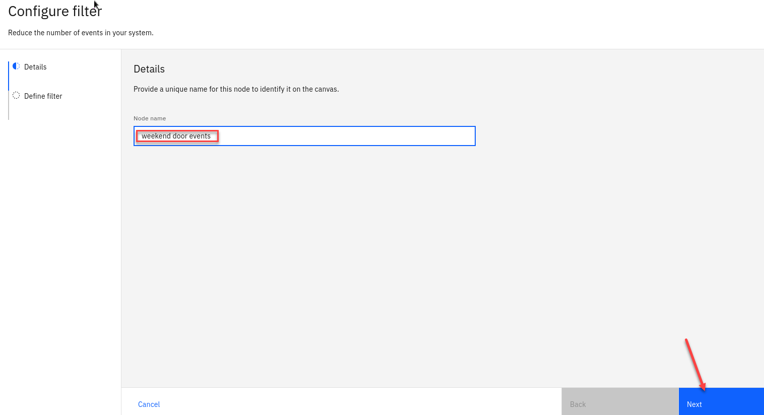 Give the filter node a name that describes the events it should identify: weekend door events