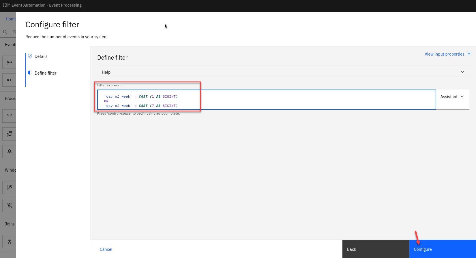 NOTE: Did you know? Including line breaks in your expressions can make them easier to read. Click Configure to finalize the filter.
