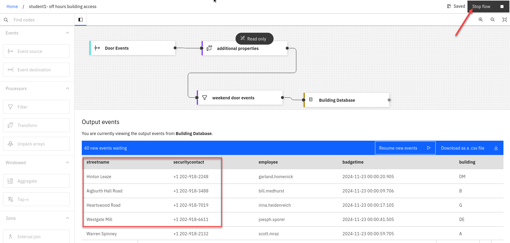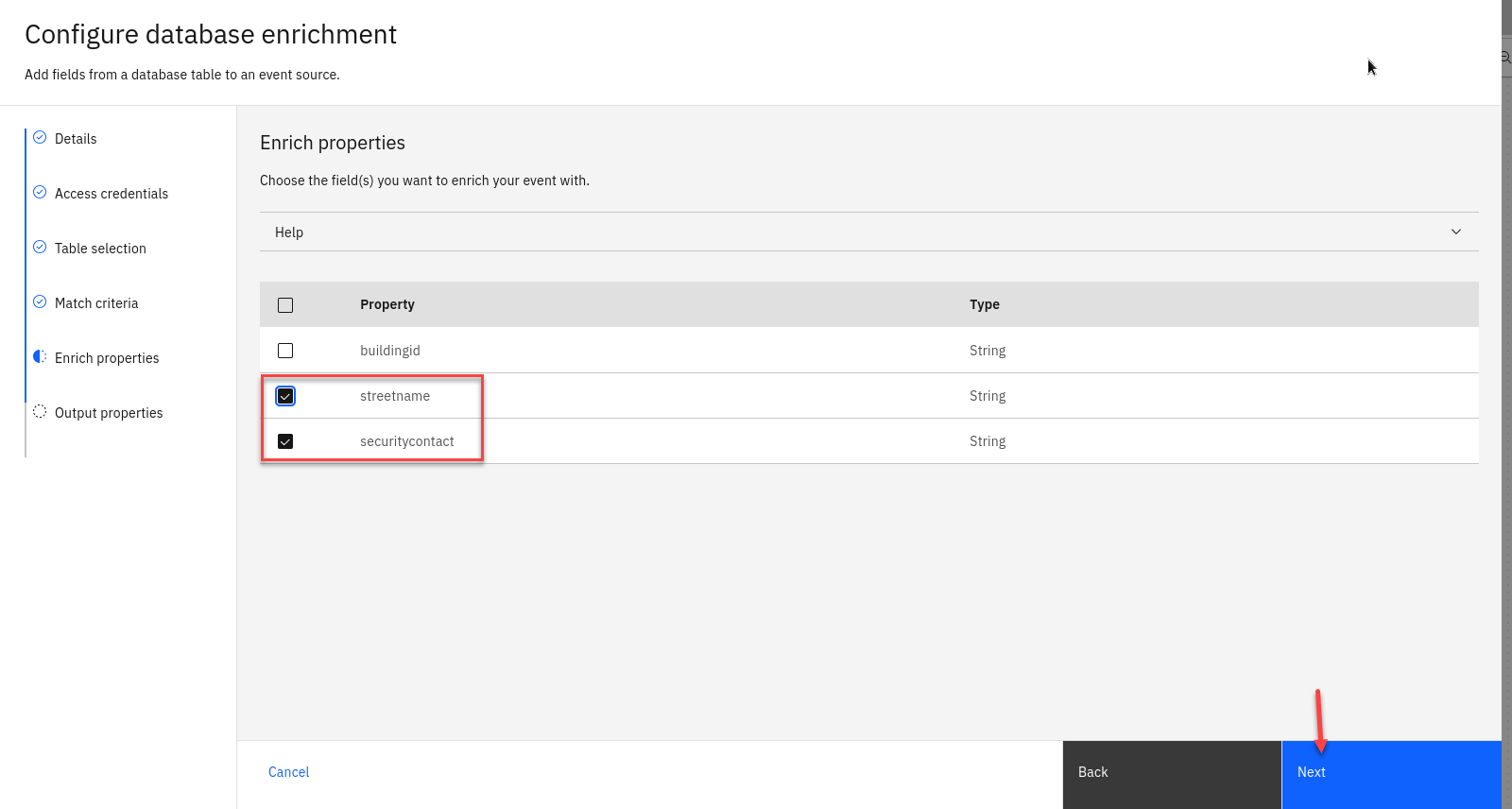 Include the street name and security contact columns. There is no need to include the buildingid column because this value is already contained in the events.