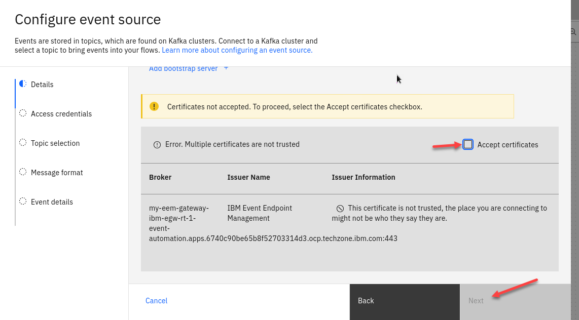 You will need to now Accept the certificates for this cluster. Click Accept certificates and then Click Next