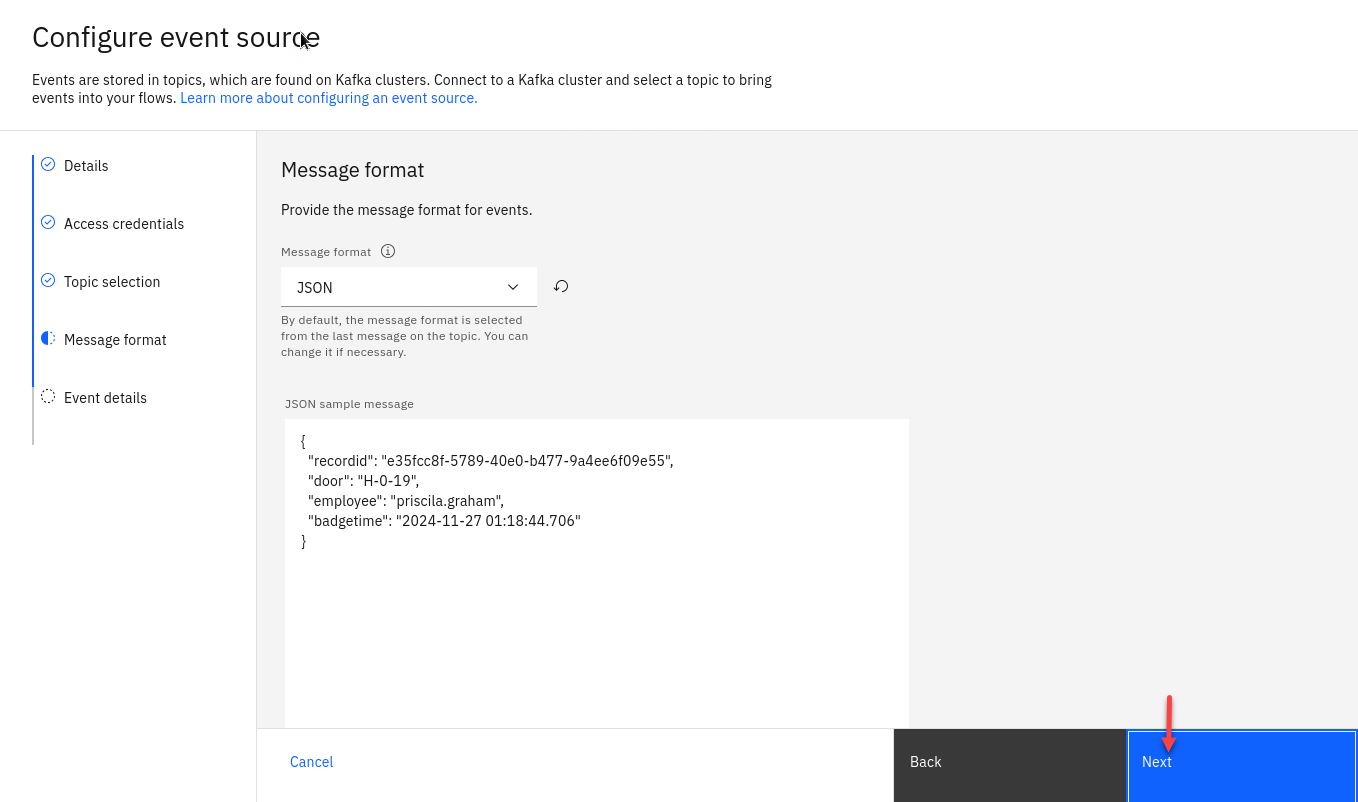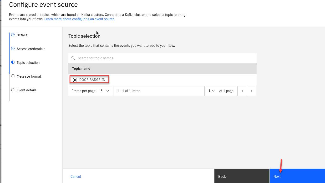 Select the DOOR.BADGEIN topic to process events from, and then click Next.