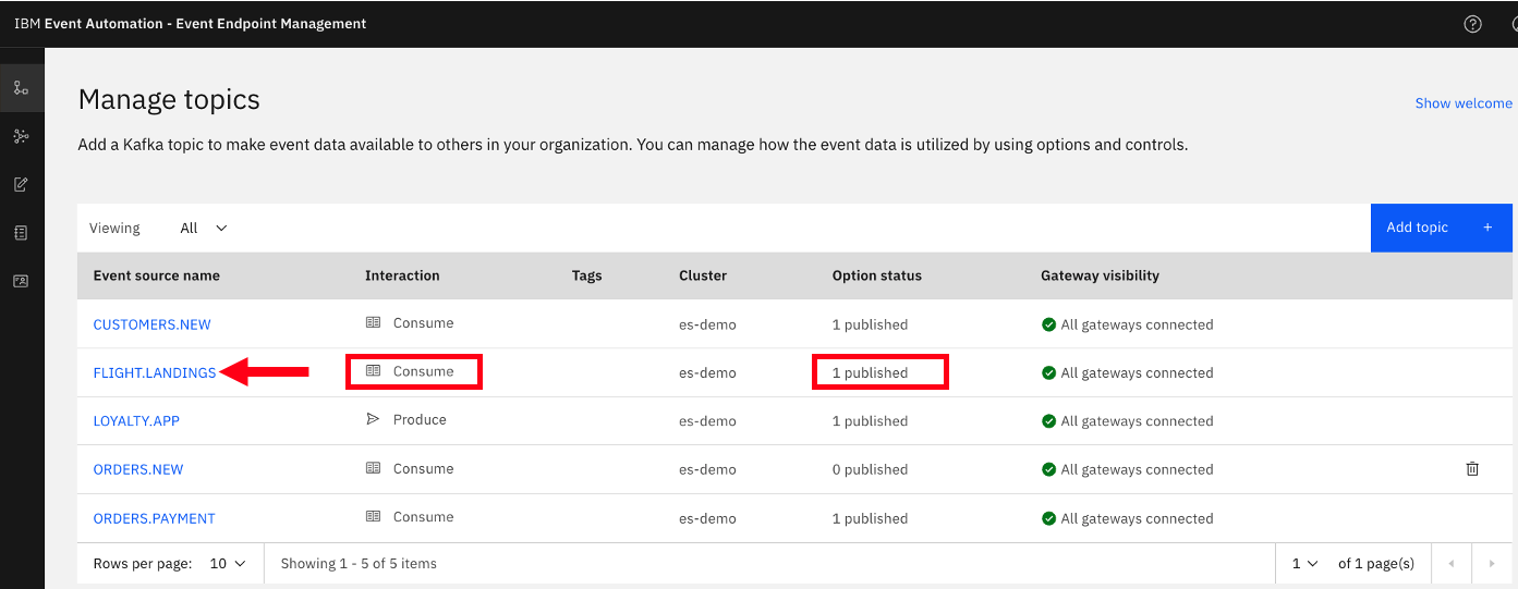 Click on the FLIGHT.LANDINGS to look at the options for the topic. Here you will see that it has been published to the Event Gateway.