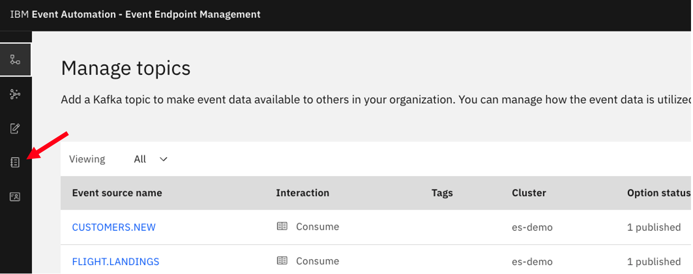 Now, click on the Catalog icon on the left to see the Published Topics to the Event Gateway.
