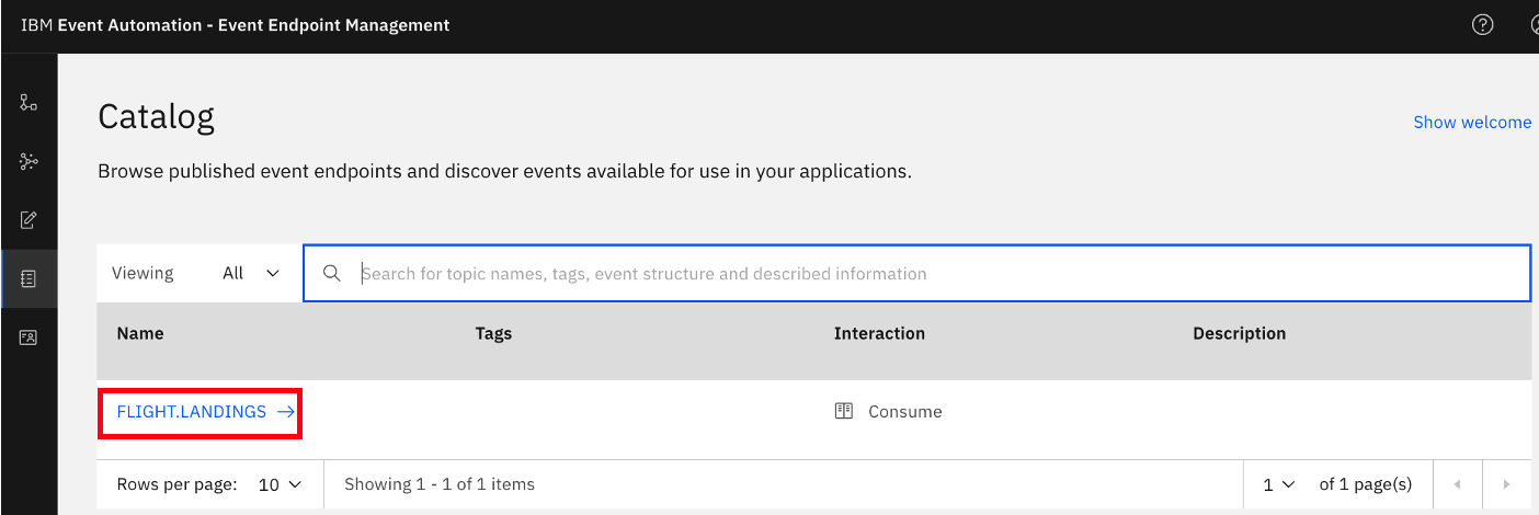 e) You will now see all AsyncAPIs that have been published in Event Endpoint Management. Select the FLIGHT.LANDINGS