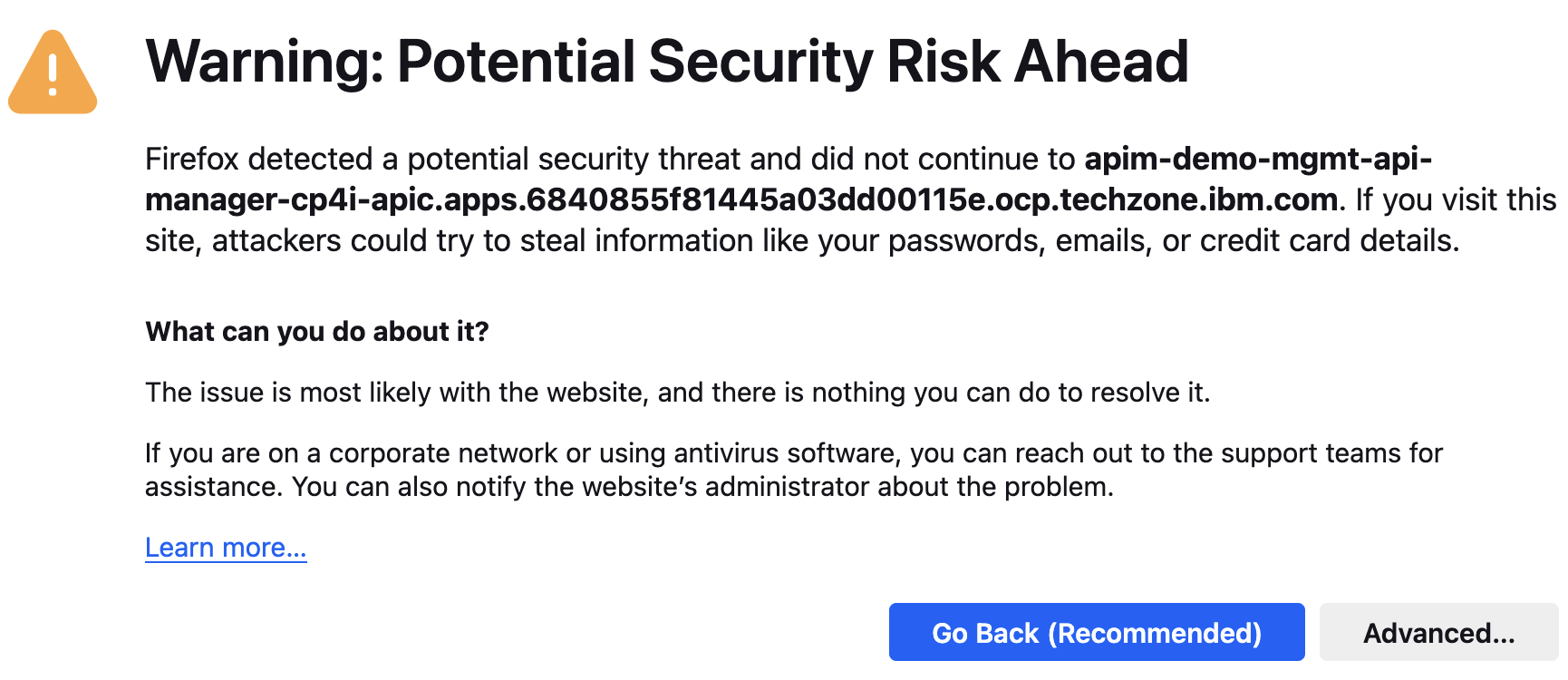 If you get “Warning: Potential Security Risk Ahead”, click “Advanced”, and click “Accept Risk and Continue” button to continue.