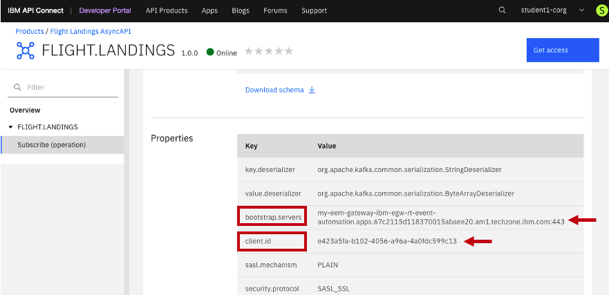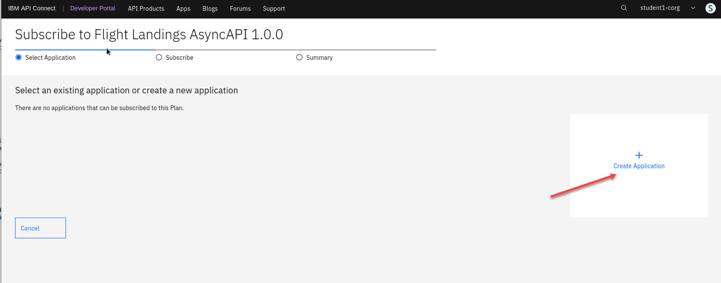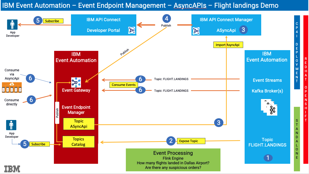 This lab will provide guidance on how to articulate and publish the FLIGHT.LANDINGS topic into EEM, followed by the establishment of the FLIGHT.LANDINGS topic as ASYNCAPI within IBM API Connect. Subsequently, the API will be made available on the IBM API Connect Developer Portal, enabling users to subscribe to and utilize events through Kafka Clients.