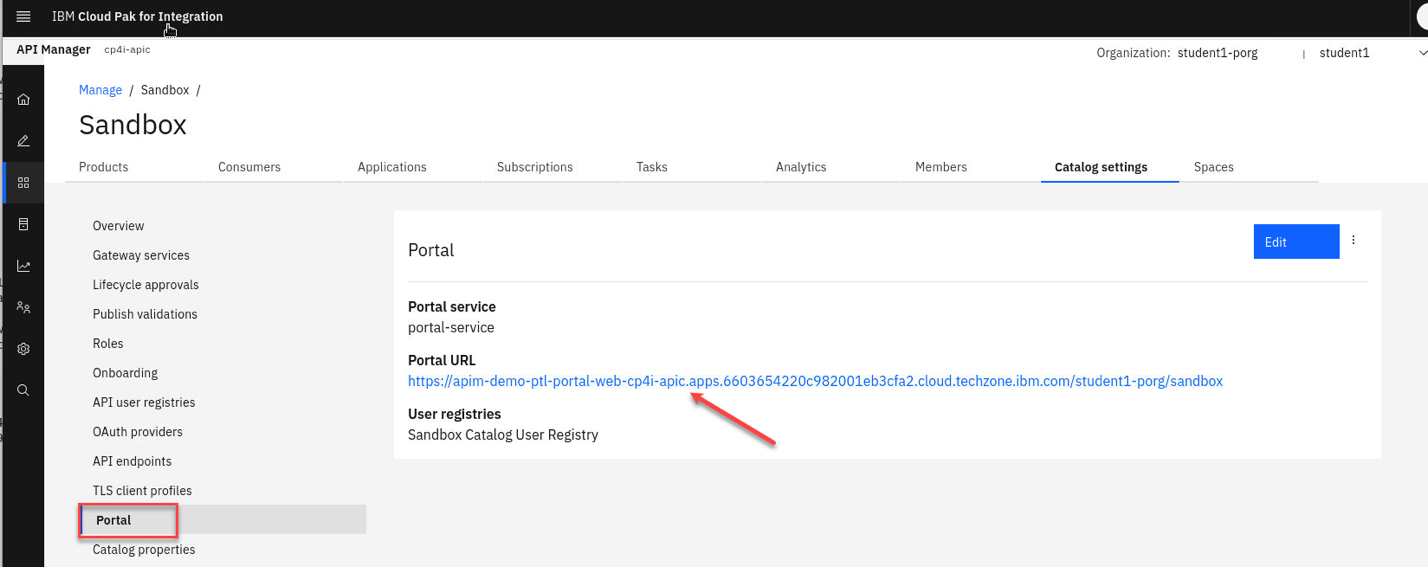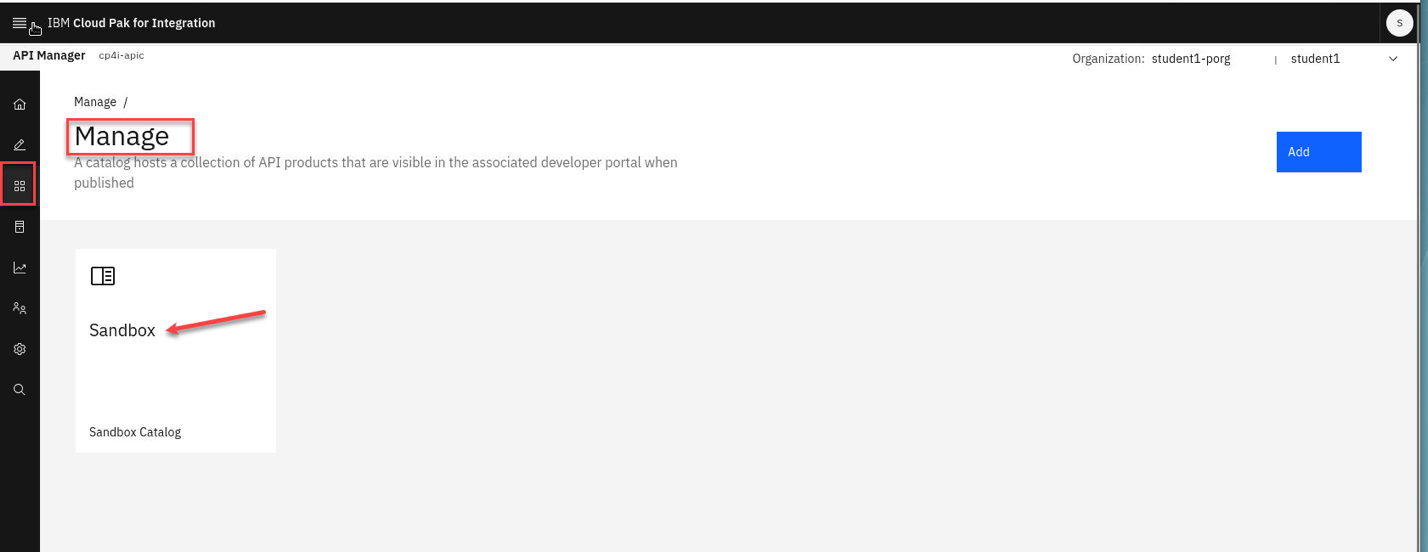 a) Locate the developer portal URL, by navigating to API Manager Home (Home Icon on top left) –> Manage Catalogs, select Sandbox Catalog.
