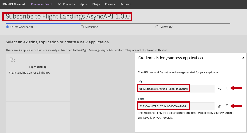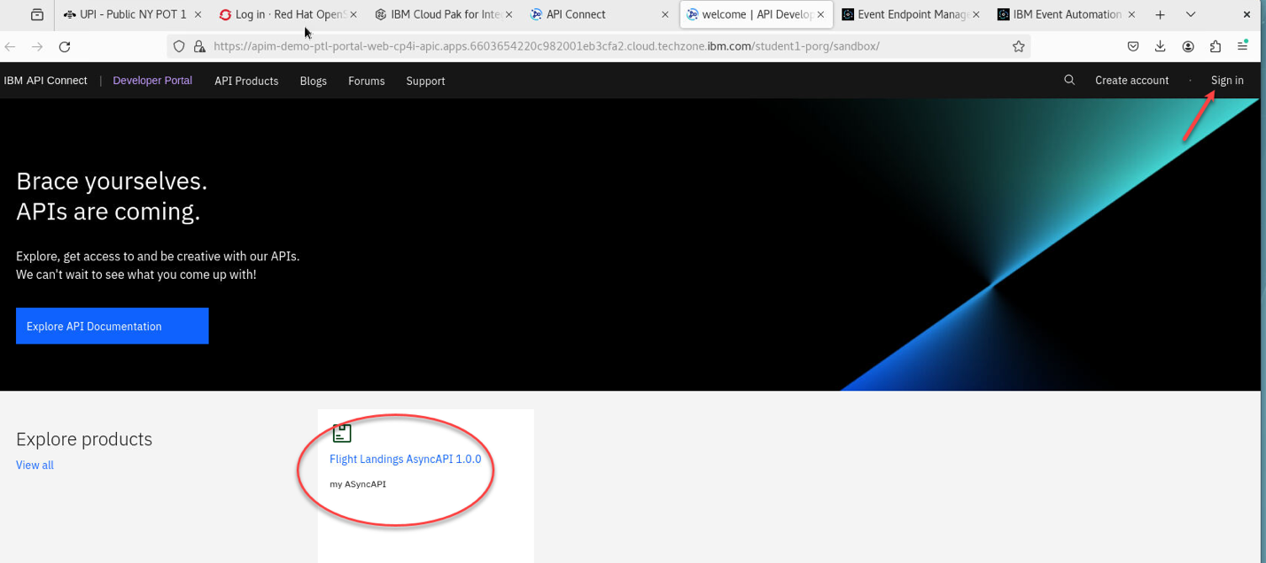 At this point, we will develop and promote the AsyncAPI for FLIGHT.LANDINGS within the IBM API Connect Management Platform. After it has been promoted, the AsyncAPI will be accessible to application development teams through the central API Connect Developer Portal, enabling them to securely subscribe to and utilize the events. The API Connect Developer Portal serves as the marketplace for all your APIs, including REST, SOAP, GraphQL, as well as the AsyncAPIs.