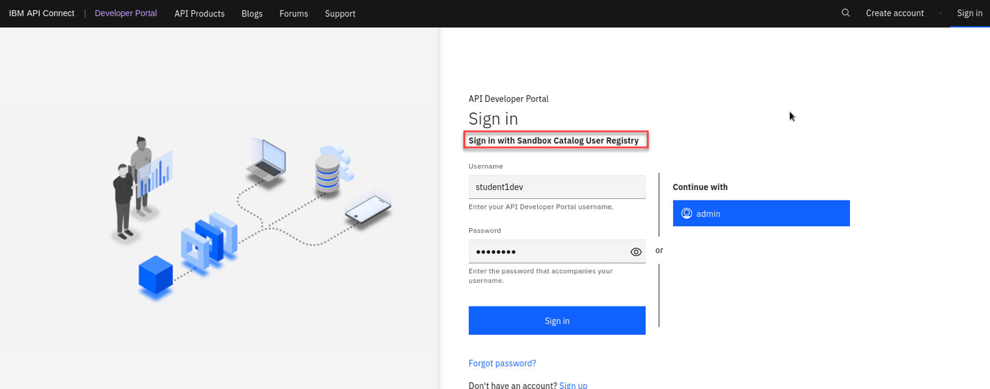 b) Sign-in to API Connect Developer Portal using your student id, and password.