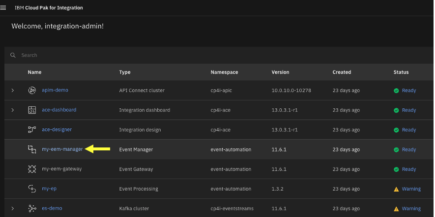 Access IBM Event Endpoint Manager (my-eem-manager) from the Cloud Pak for Integration Platform Navigator Console.