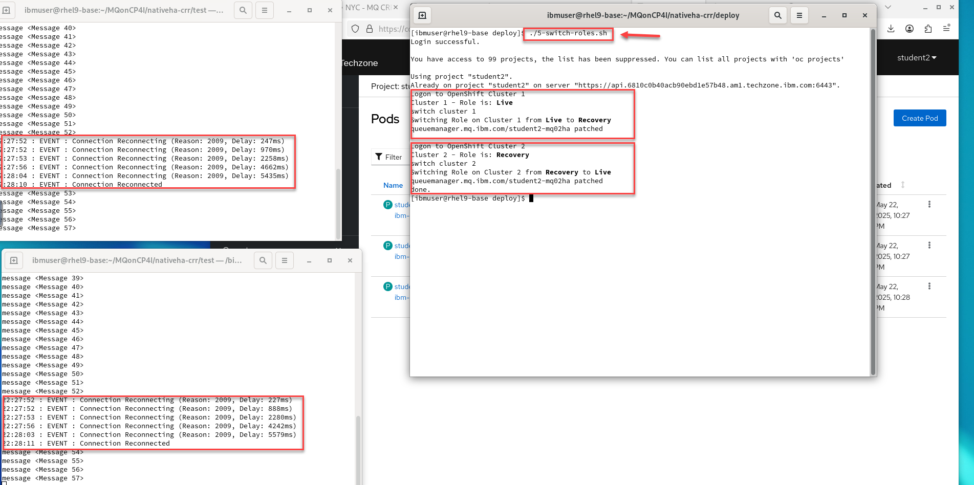 When the QMgr is patched the pods will be restarted and you will see the getting and sending app disconnect and reconnect to the other cluster.