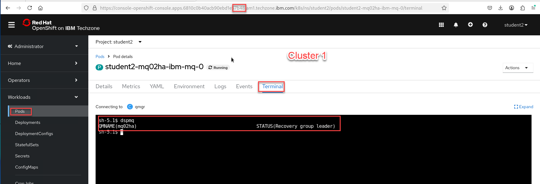 Login to the OCP console for each cluster and see that the state of the QMgrs have changed.