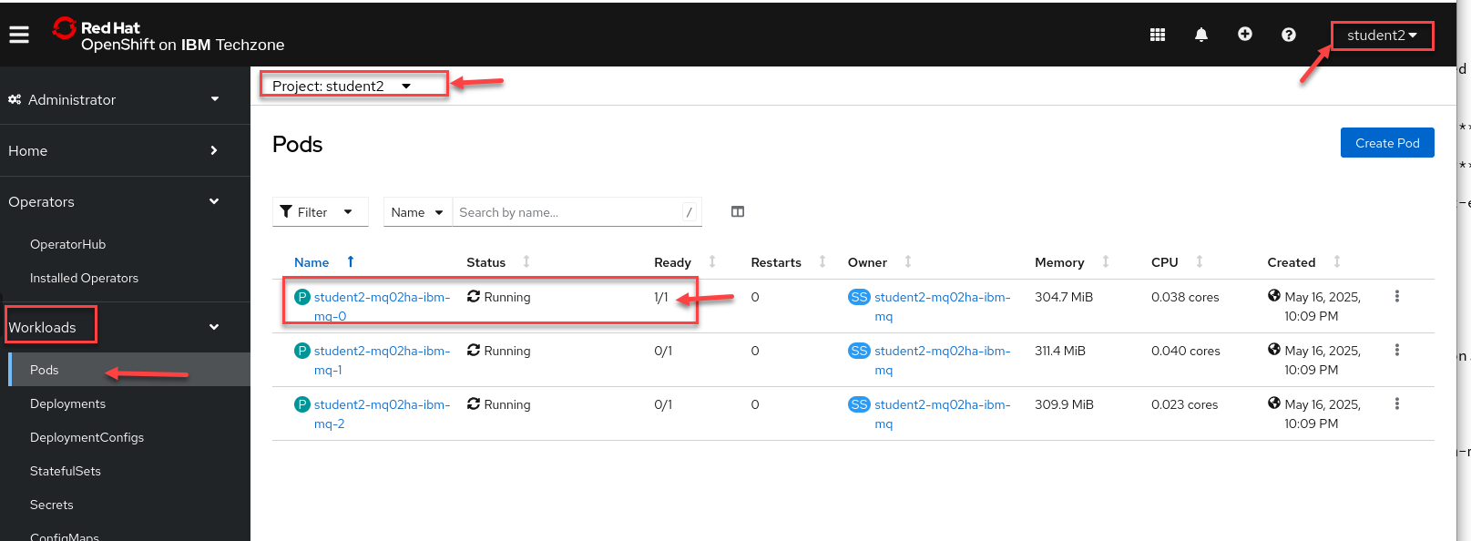 Note: Make sure you are login with your student account and your namespace/project is for your account. In this example we are showing Student2