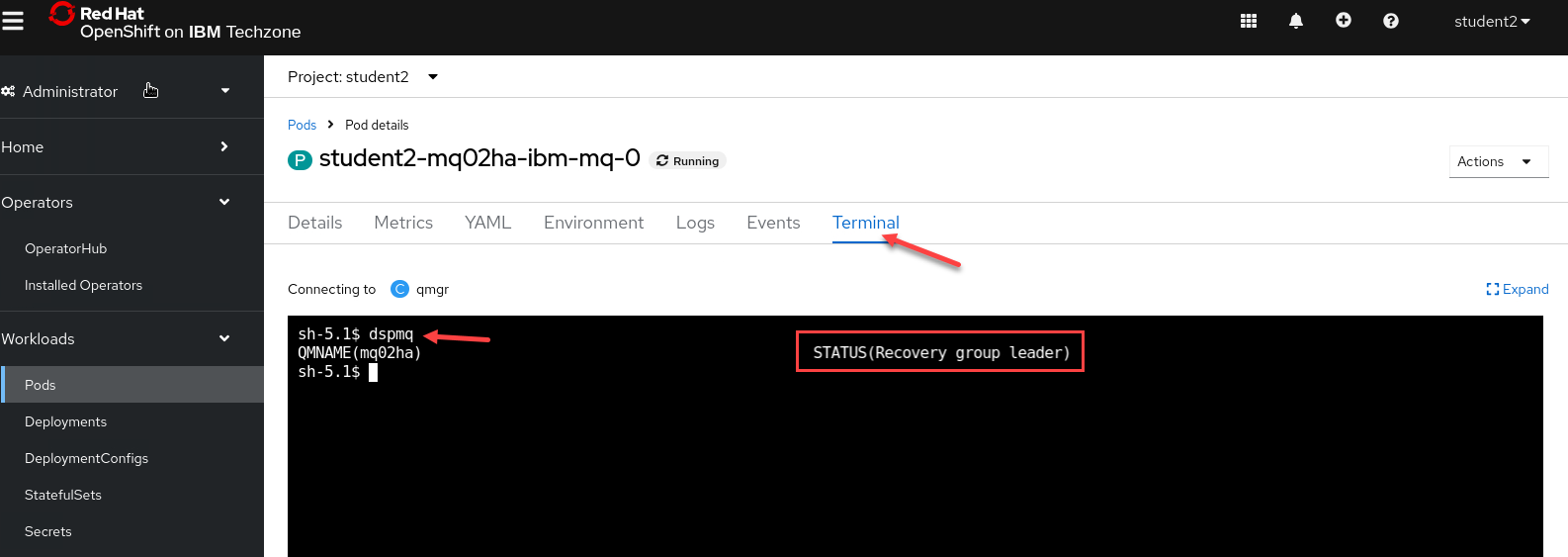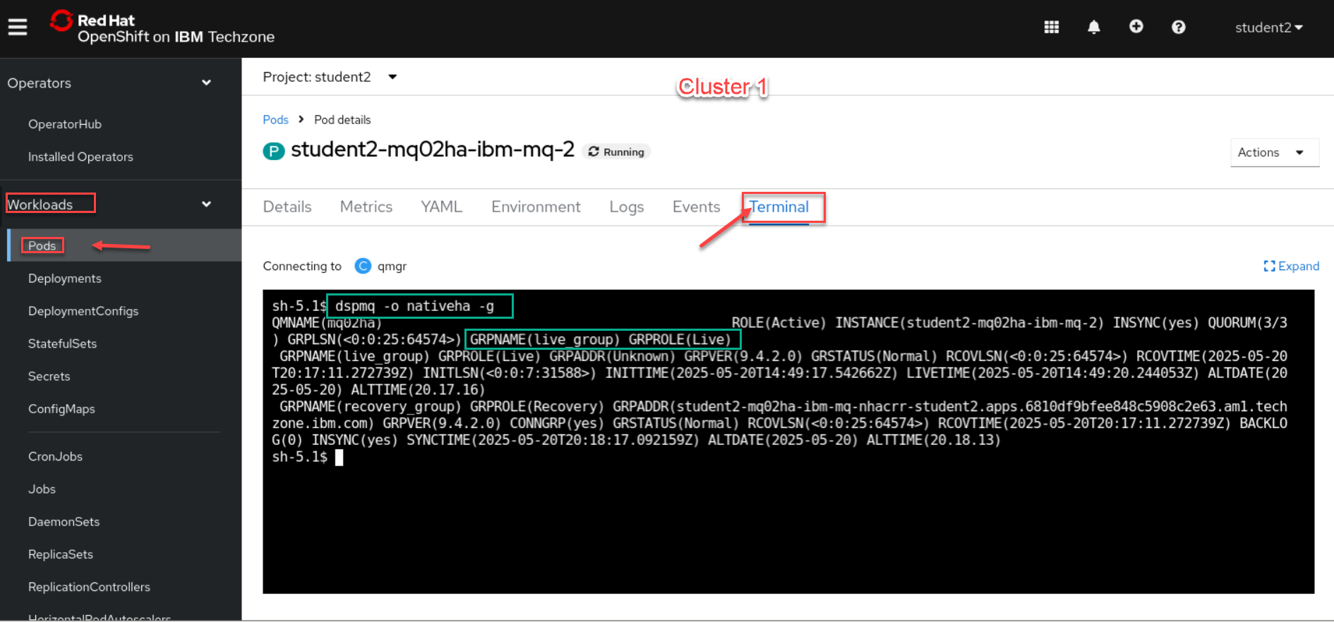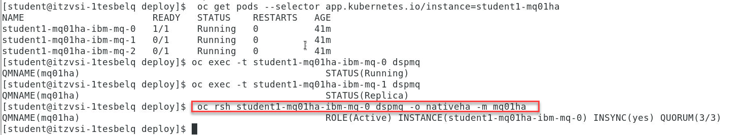 oc rsh student1-mq01ha-ibm-mq-0 dspmq -o nativeha -m mq01ha