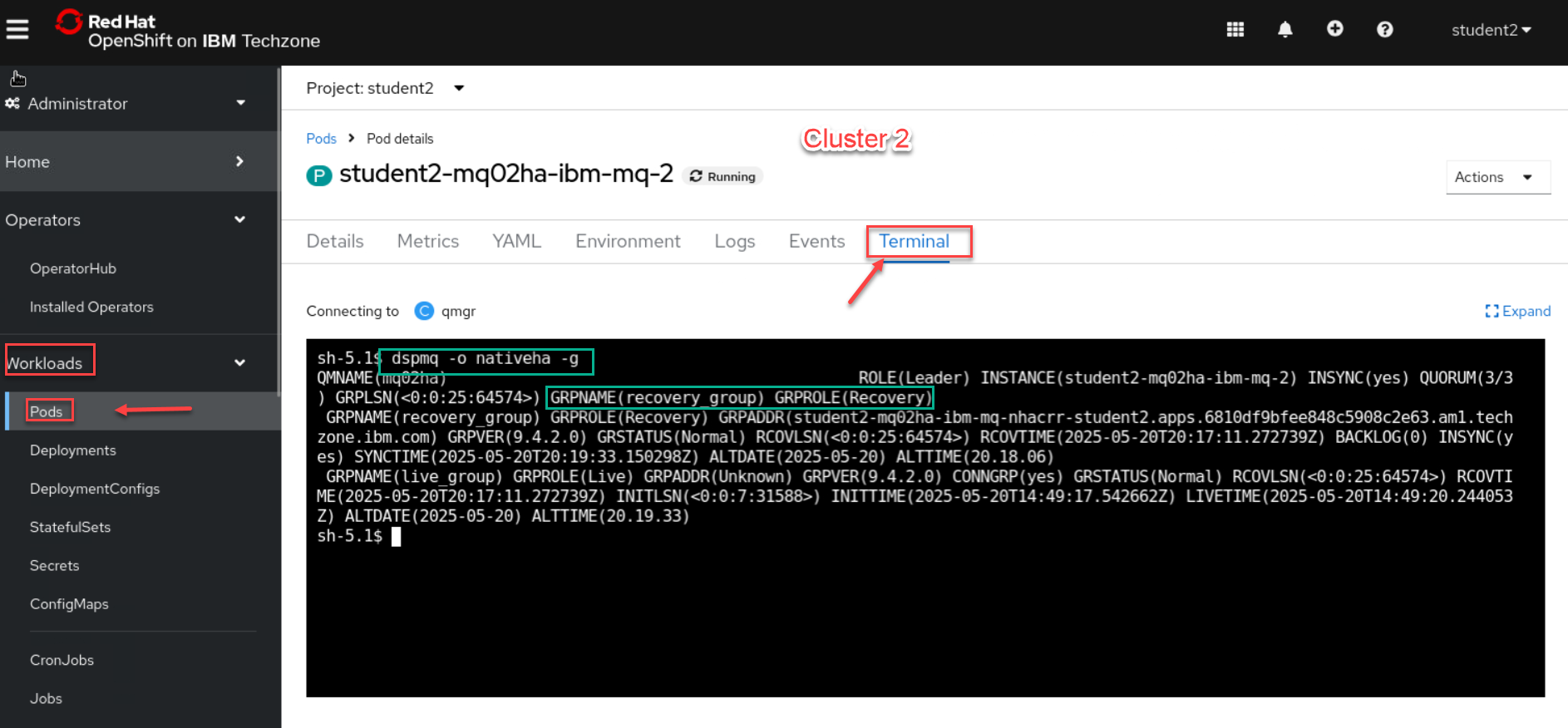 Now go to the OCP console for Cluster 2. Under Workload select Pods