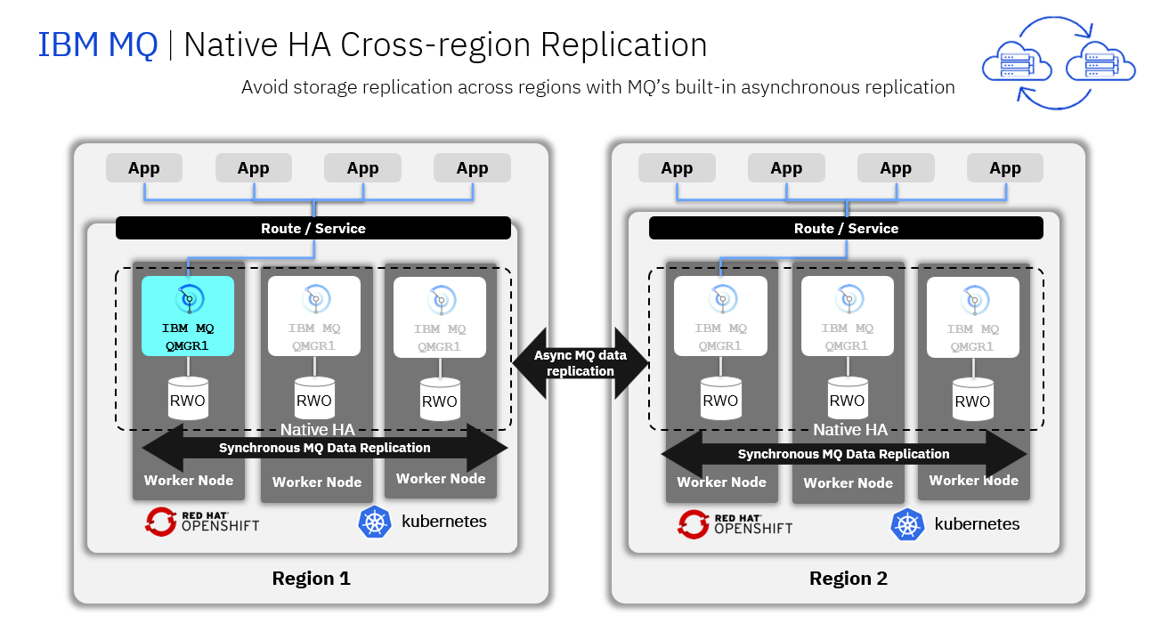 A Native HA Cross Region Replication provides a replication of queue manager where the recoverable MQ data (for example, the messages) are replicated across regions to a recovery instance of the Queue manager.