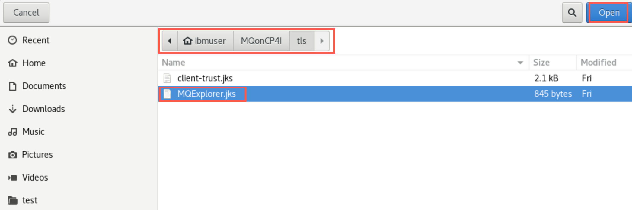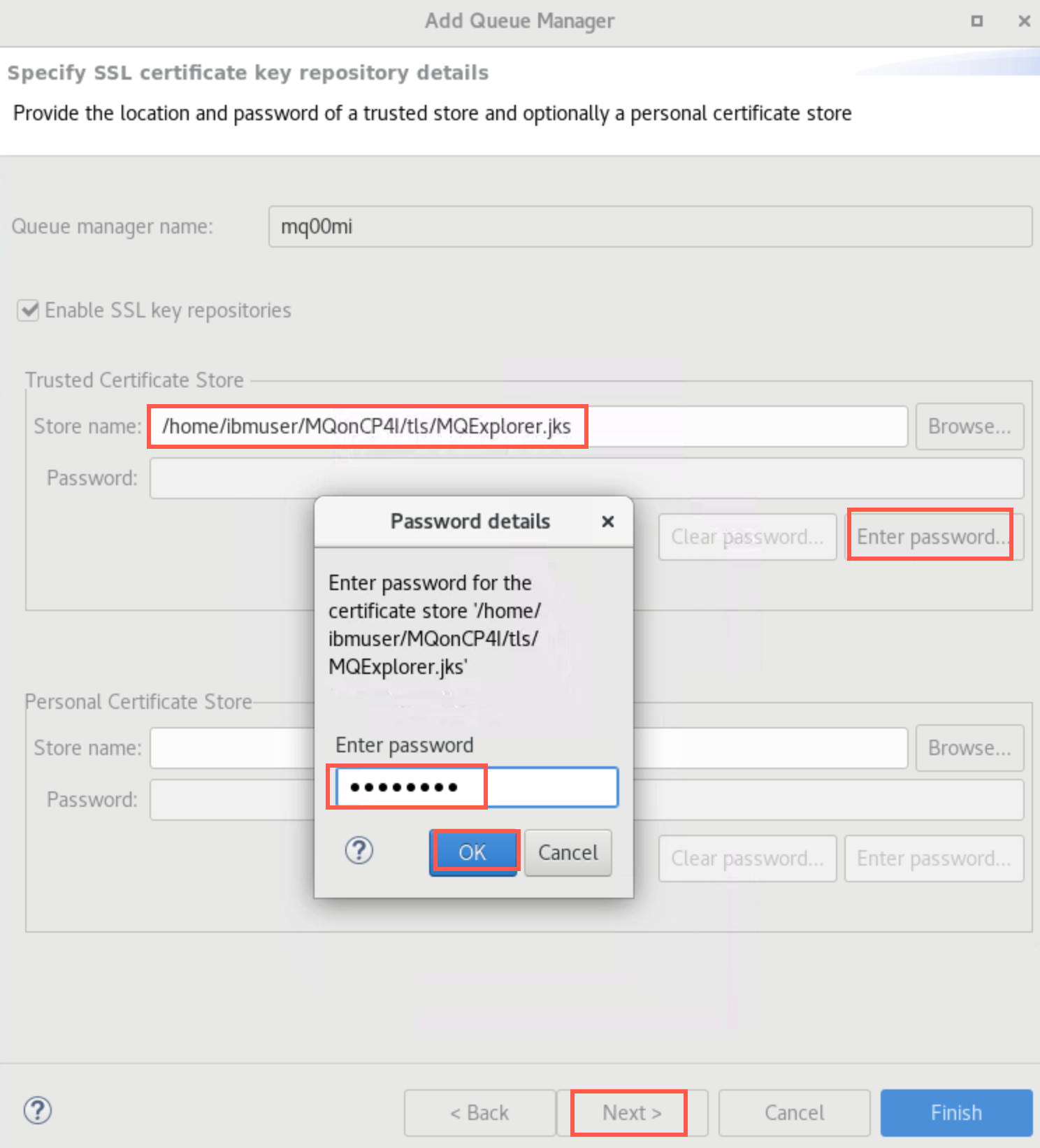Click the checkbox for Enable SSL key repositories. Click Browse and navigate to /home/ibmuser/MQonCP4I/tls and select MQExplorer.jks. Then click Open.