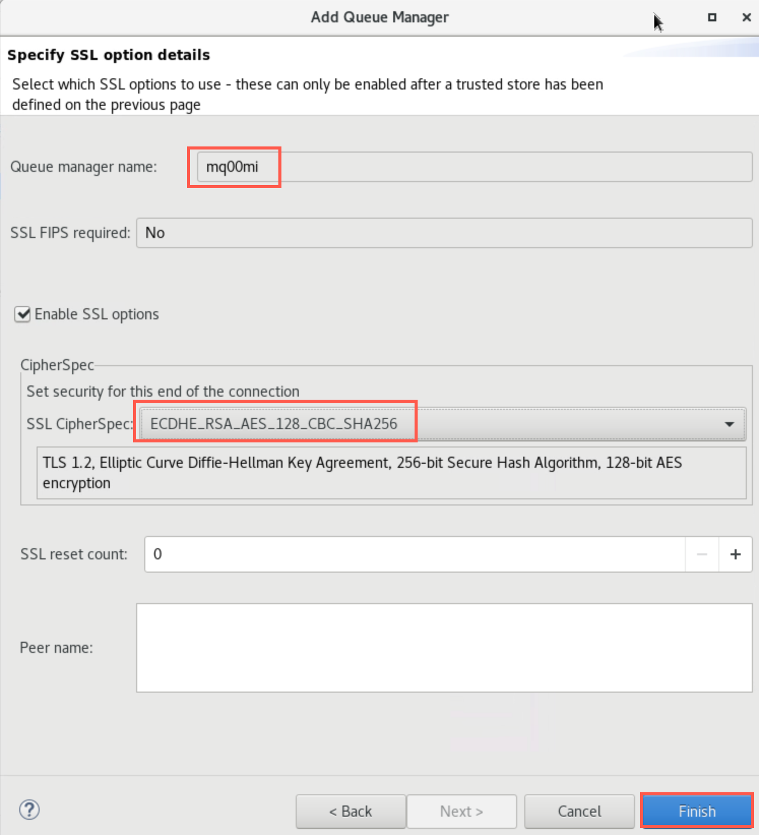 On the next screen click the checkbox for Enable SSL options. Click the drop-down next to SSL CipherSpec and select ANY_TLS12_OR_HIGHER.