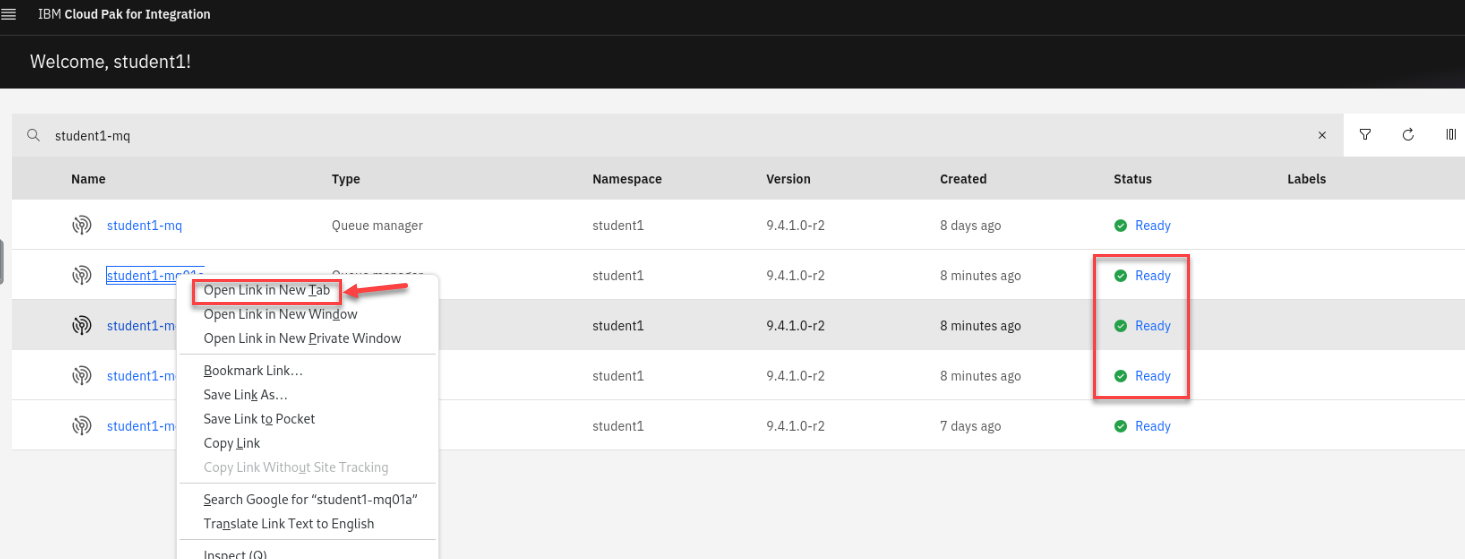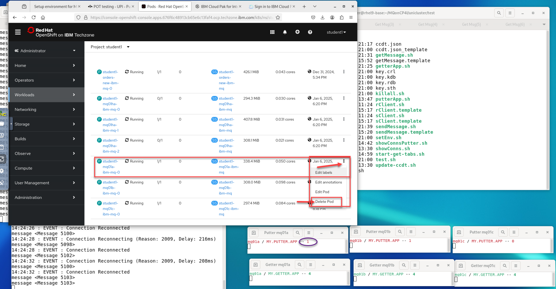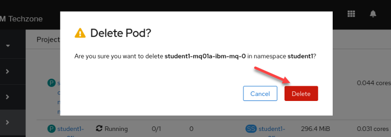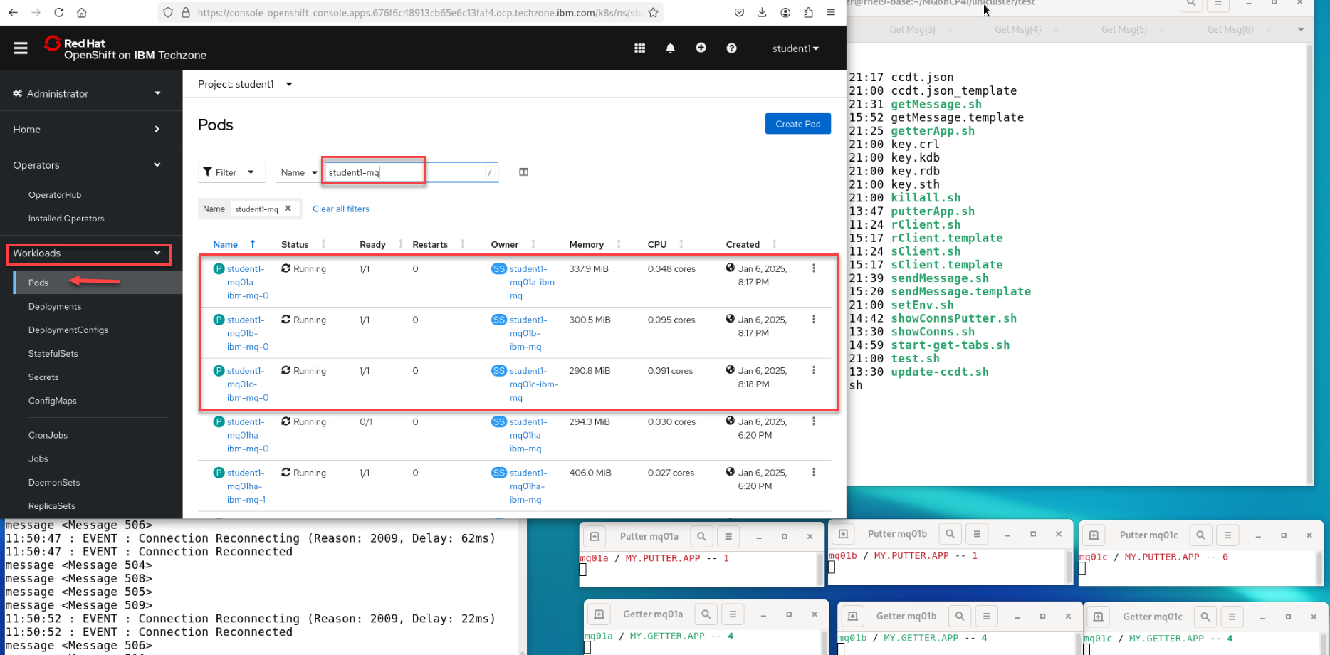 Return to the OpenShift Console tab in the web browser. You should still be in your studentx Project. Click the drop-down for Workloads and select pods. Filter on your student-mq queue managers.