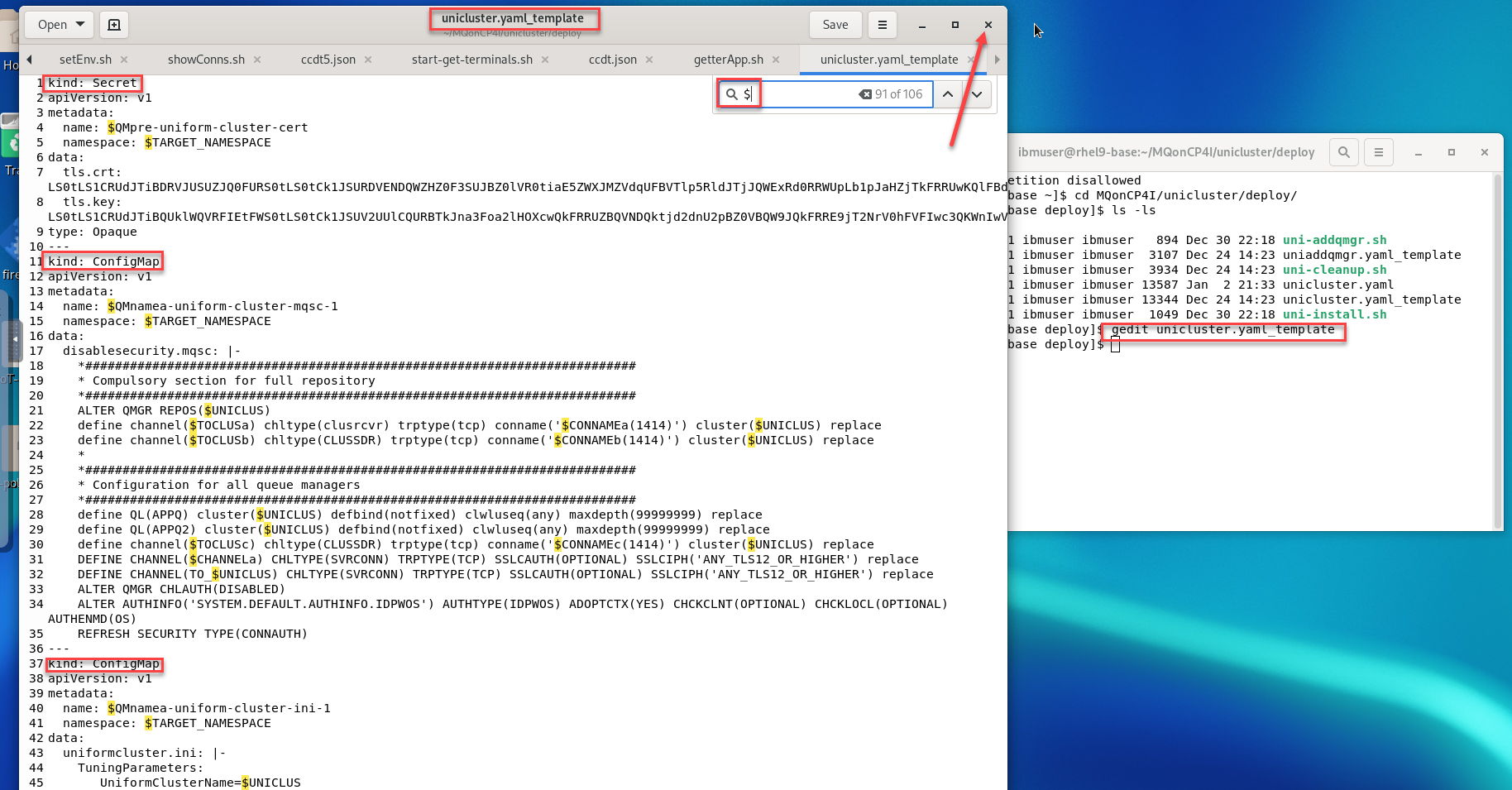 Review the yaml template file. Scan through the template which has definitions for all three queue managers. Your environment variables will be substituted throughout the file. If you execute a find for “$” you can easily locate the substitutions.