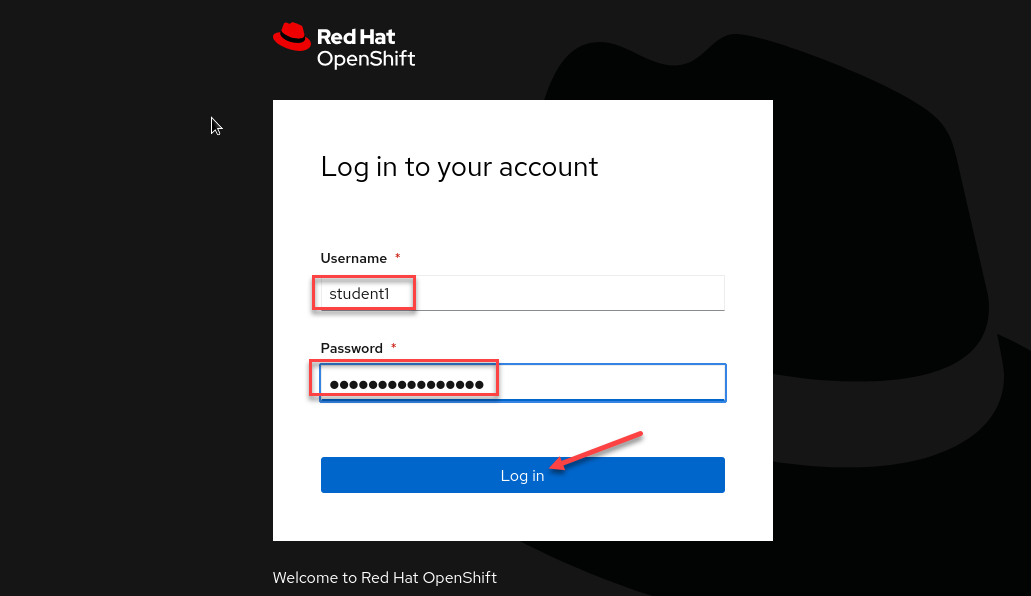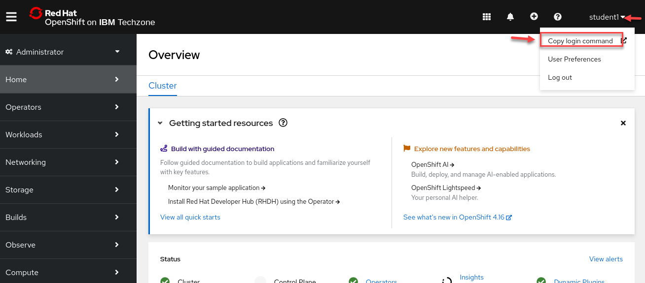 You should still be logged into the OpenShift environment. Click on your username on the top right menu of the OpenShift Console, then click on Copy Login Command.