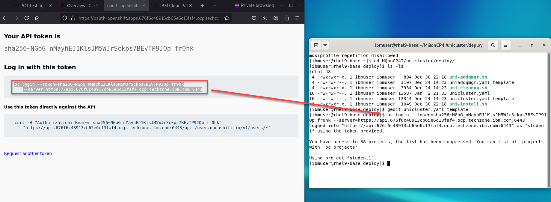 In the new terminal click the plus + to create a new tab and make sure both tabs are in the /home/ibmuser/MQonCP4I/unicluster/test/