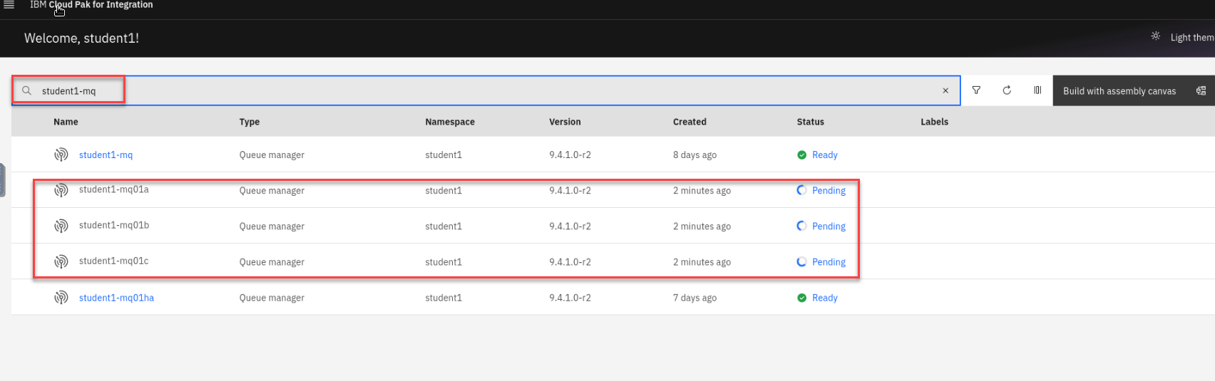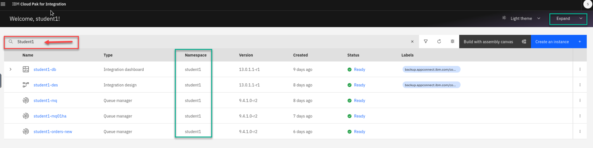 Note: You can use the search option to show just your instances in your student namespace. (ex: student1)