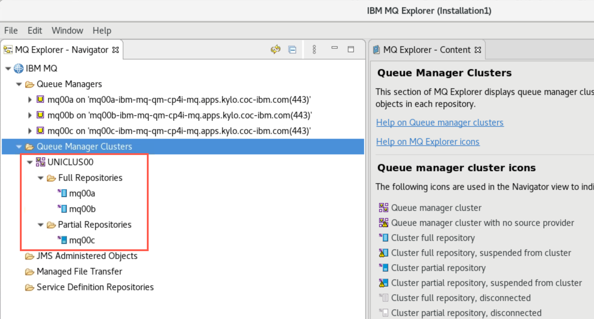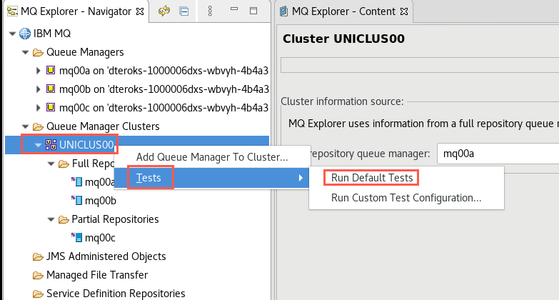 Expand Queue Manager Clusters to confirm that queue managers mqxxa and mqxxb have full repositories, while mqxxc has a partial repository.