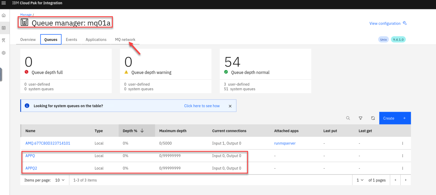 You will see the two local queues APPQ and APPQ2 which were defined by the mqsc ConfigMap defined in the yaml template. The other queue managers also have the queues by that name.