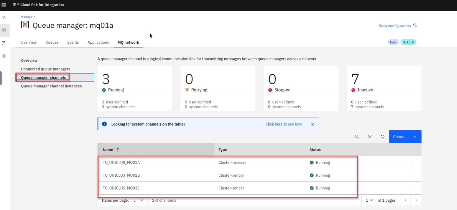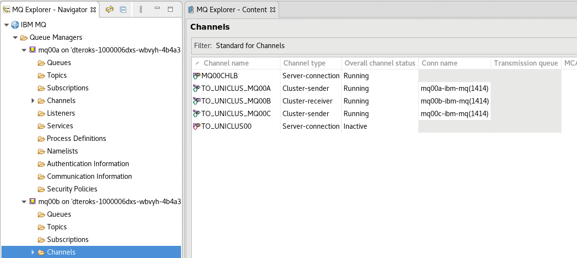 Here you find your cluster channels. If you looked closely at the yaml template, you’ll remember that your mqxxa and mqxxb are the primary repositories for your cluster UNICLUSxx. While looking at mqxxa you see a cluster receiver channel TO_UNICLUS_MQ00A and two cluster sender channels TO_UNICLUS_MQ00B and TO_UNICLUS_MQ00C. They should be Running.