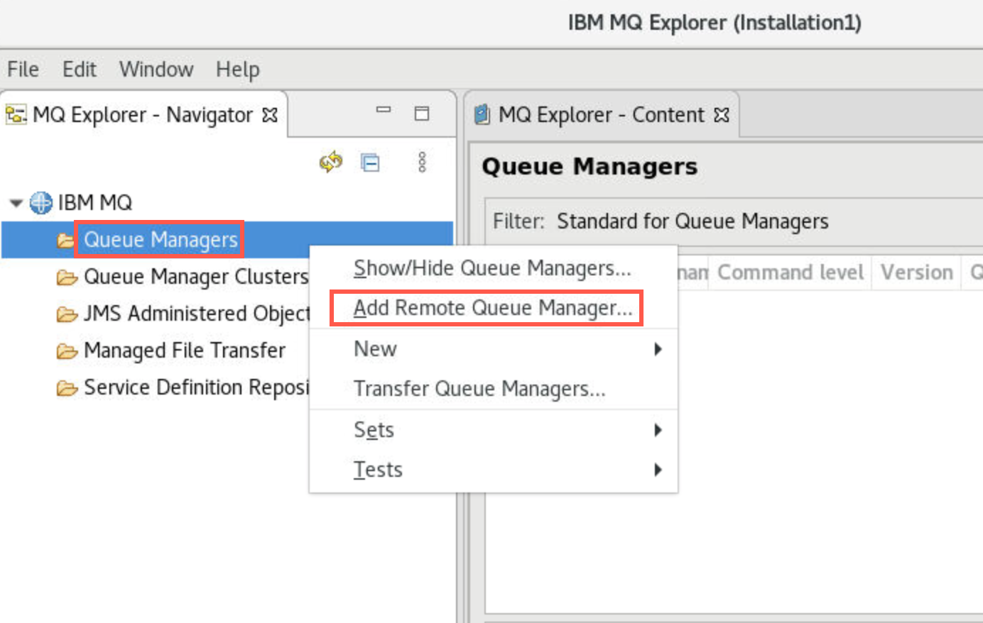 When the utility is ready, right-click Queue Managers and select Add Remote Queue Manager.