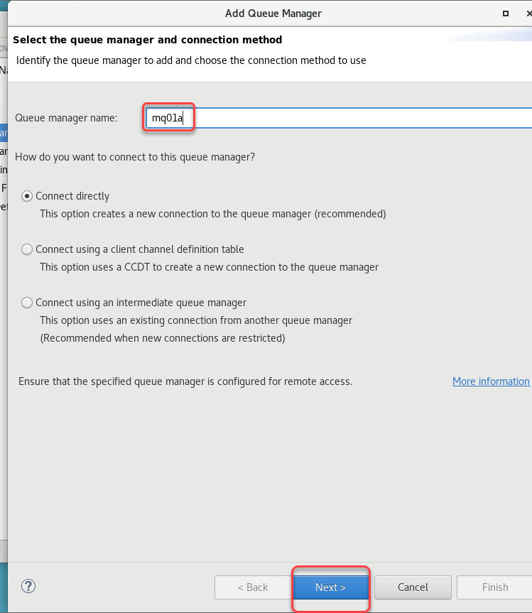 Click Finish. You will get a pop-up saying “Trying to connect to the queue manager”.
