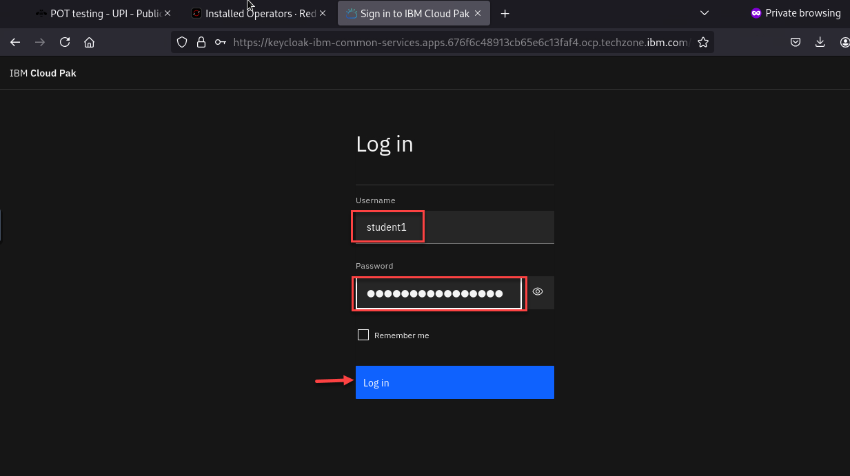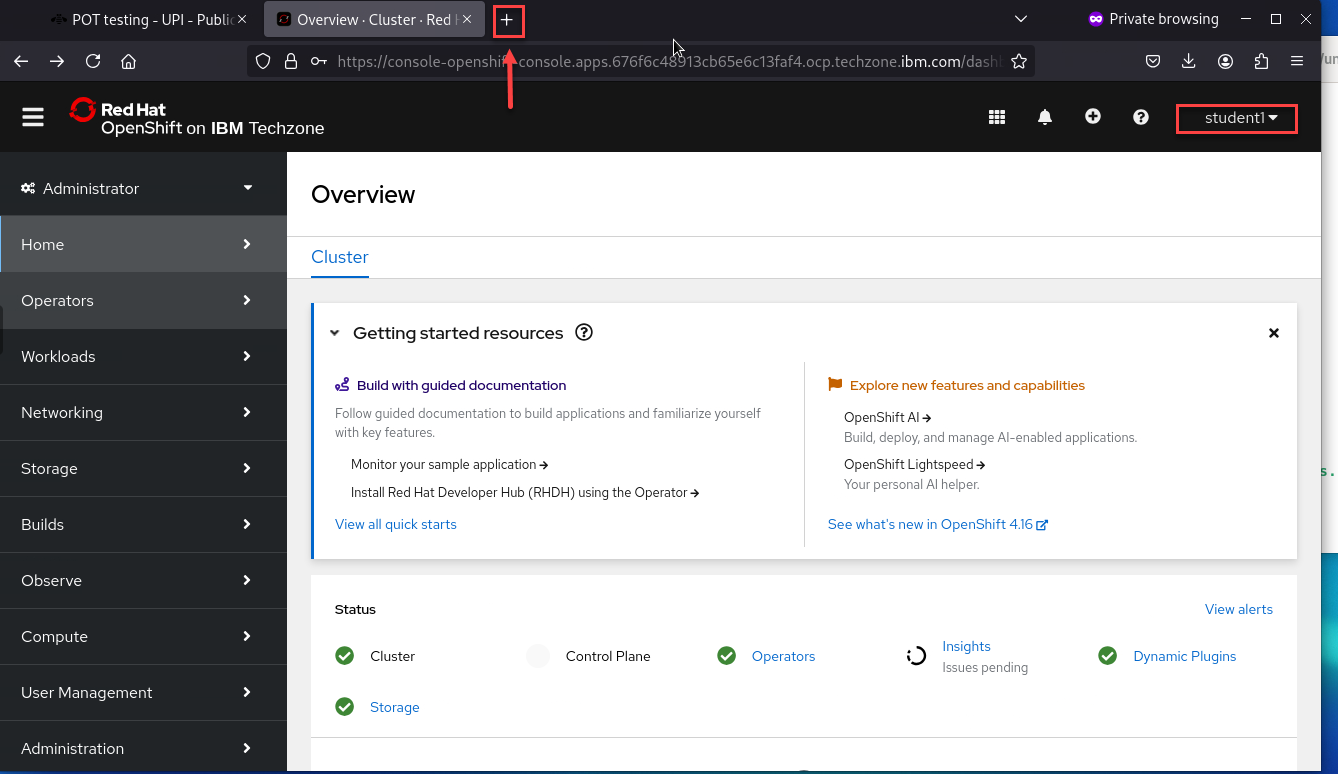 Navigate to the URL for the OCP console provided in your PoT email. If required to log in use the userid / password provided in the email.