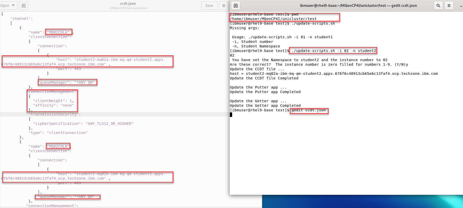 In the classroom environment, We have a ccdt.json_template file that we will use to create the ccdt.json for the testing. There is an update script that will update the clientConnection name depending on your student number and will pull the host from OCP.