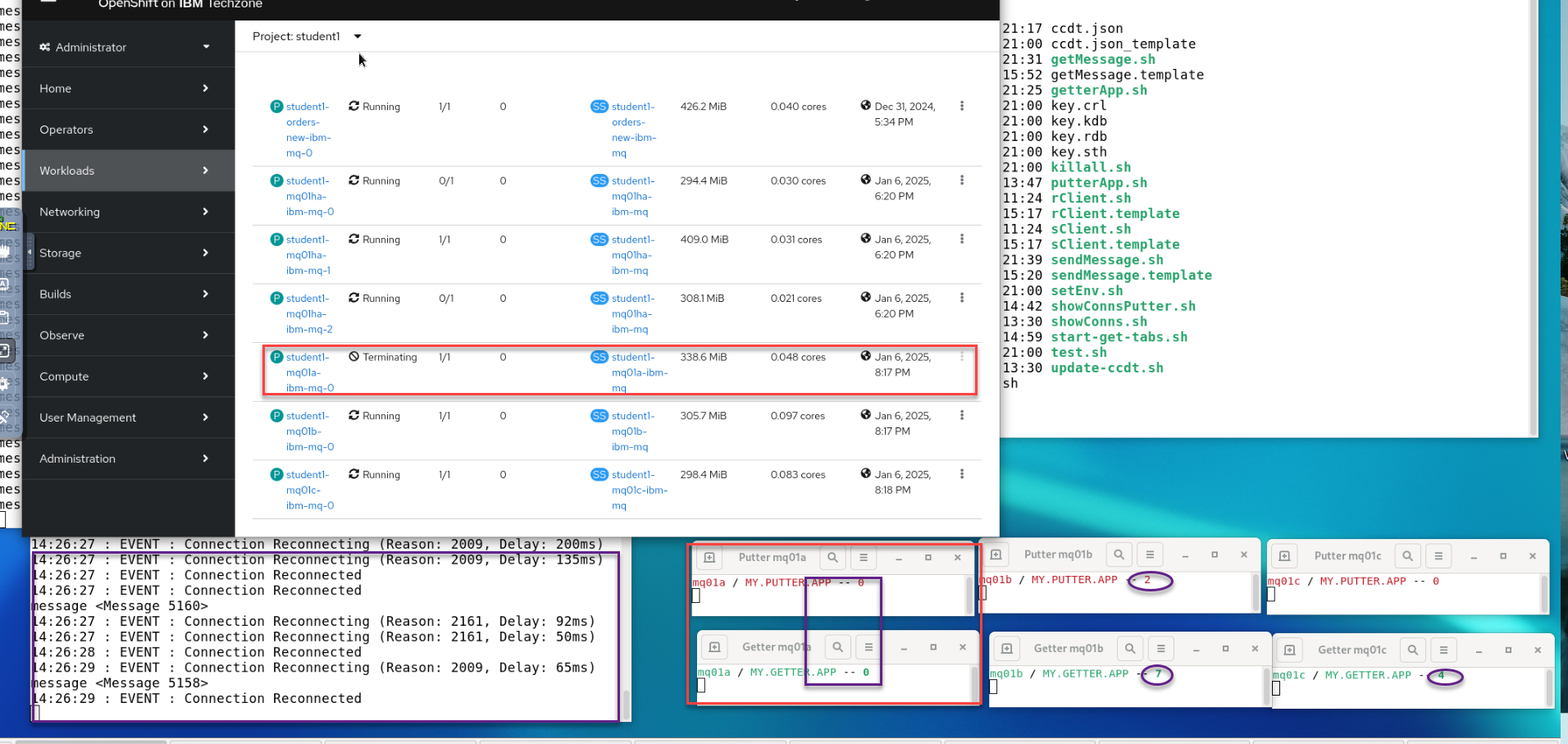 You will now see the Pod you just deleted in a Terminating state. You will also see in your sender window the application reconnecting. In the Putter and Getter connection monitoring terminals you will see that the QMgr we stopped is zero connections and the other two QMgrs will rebalance the load.
