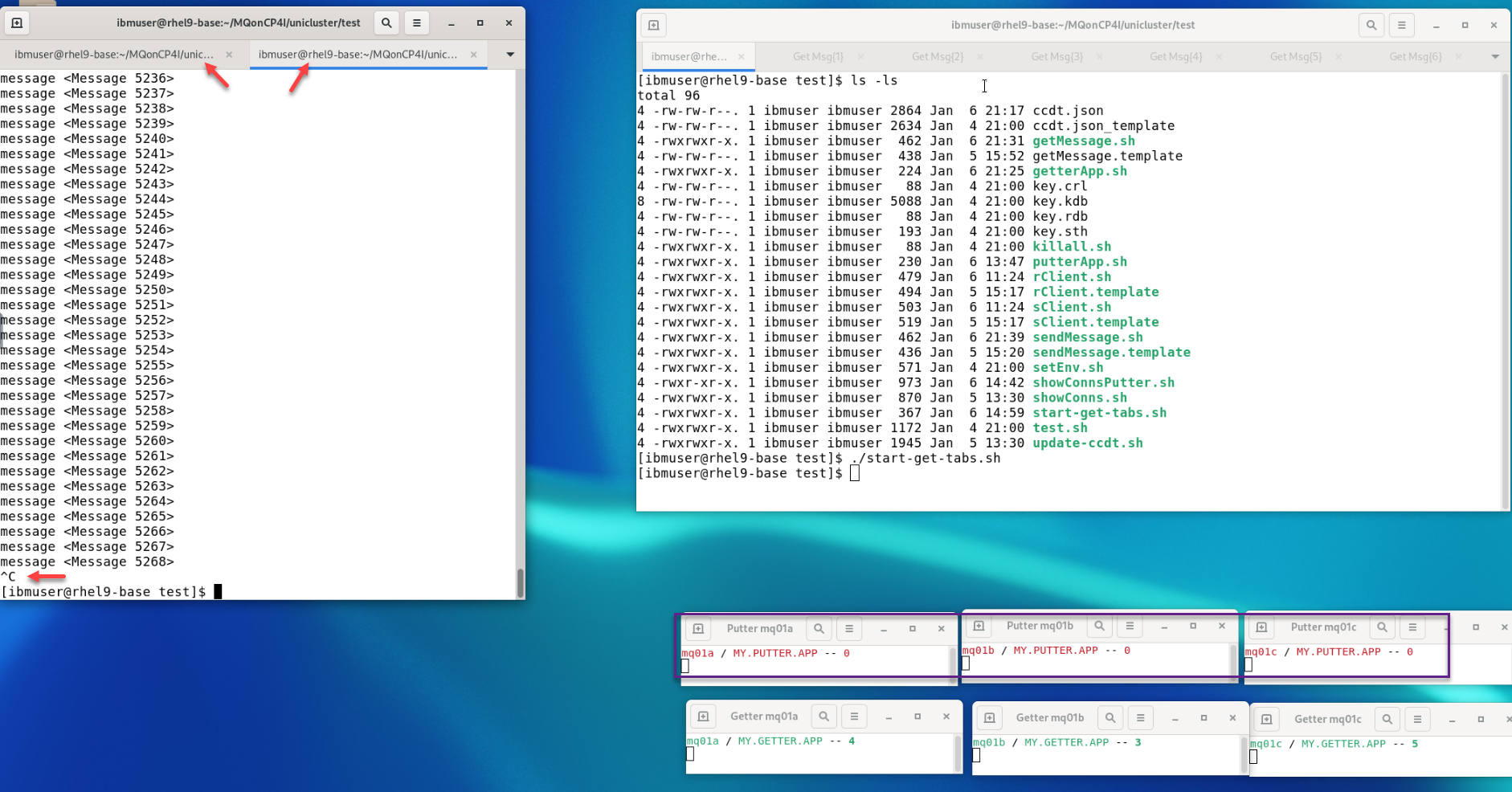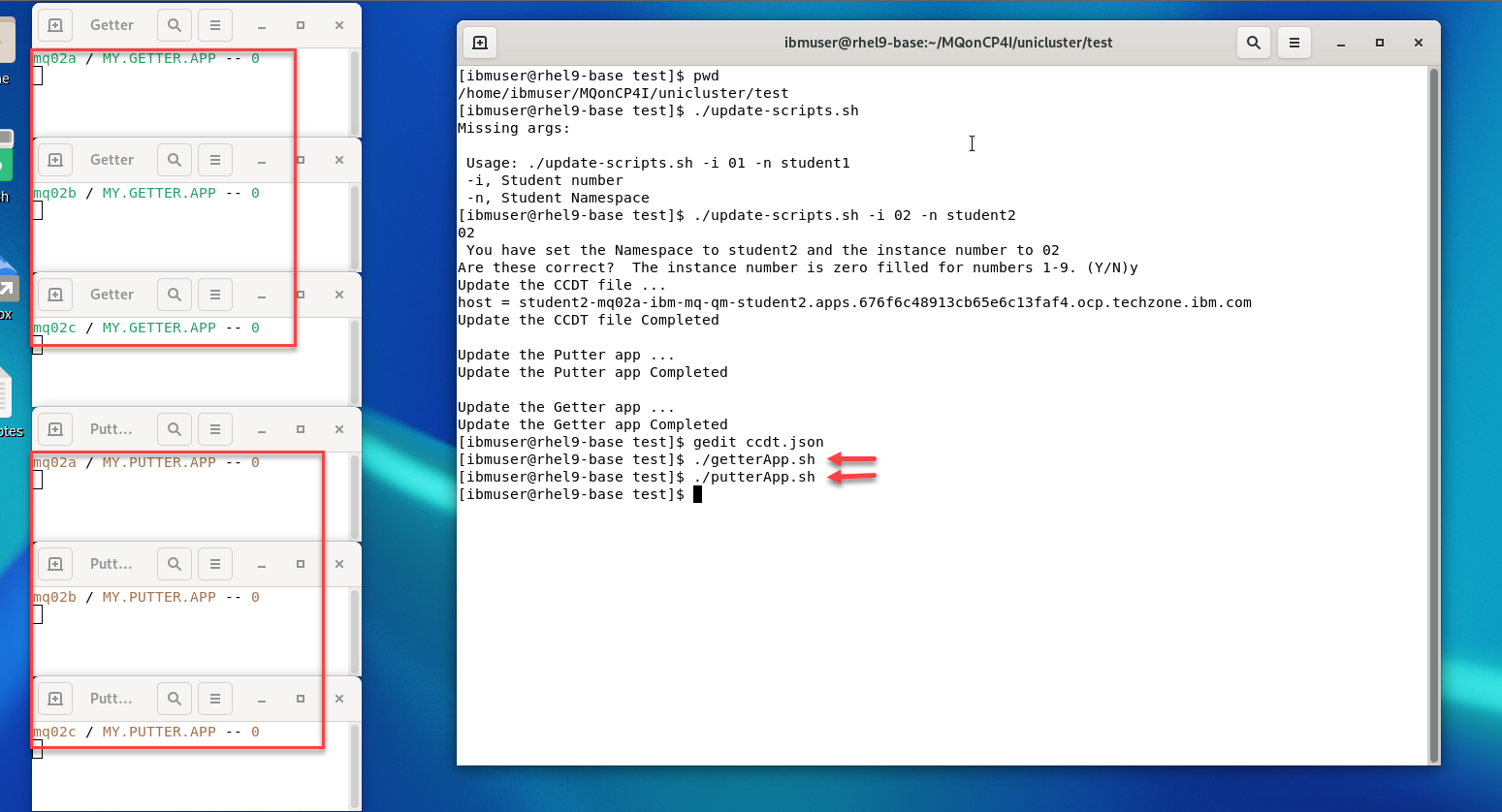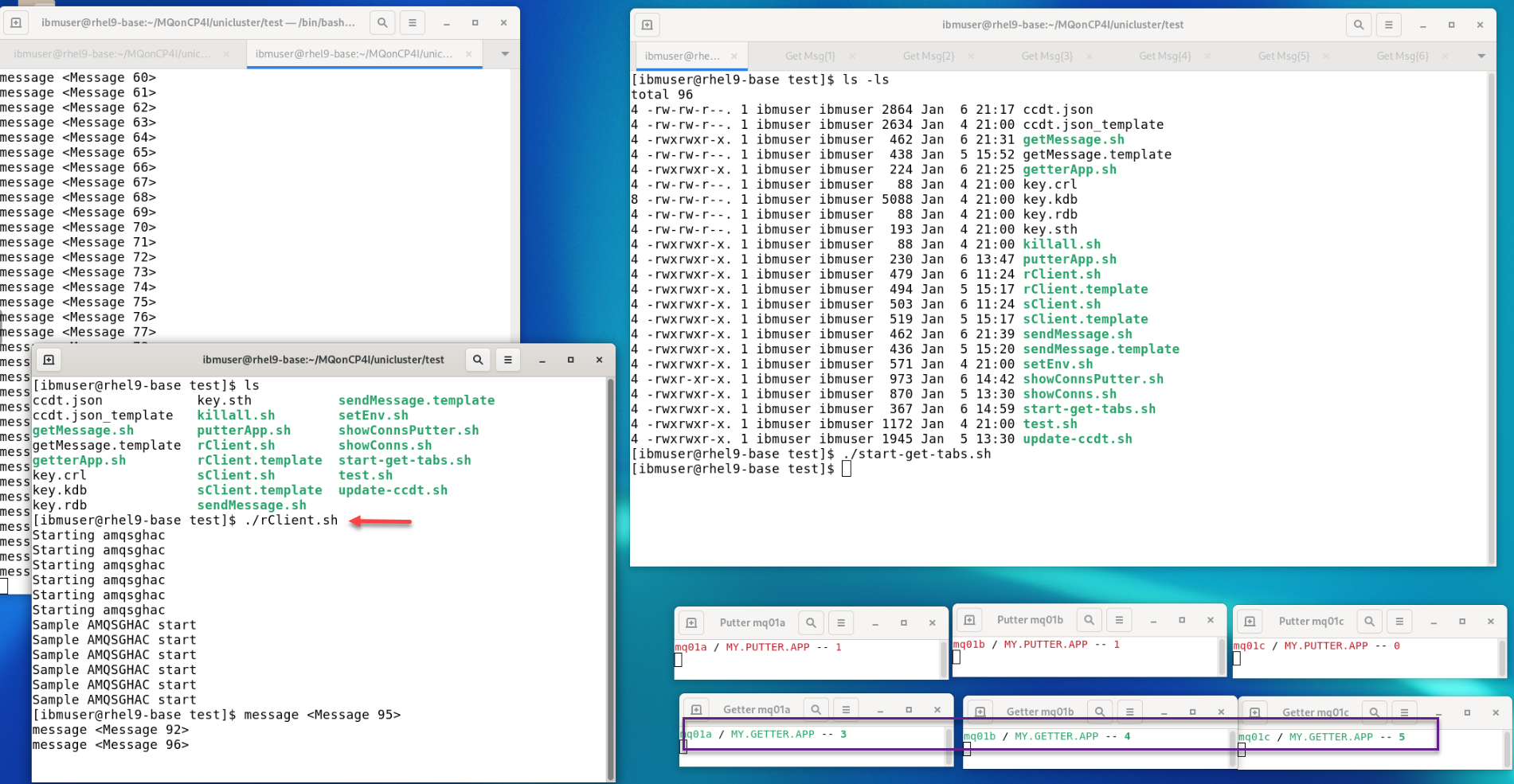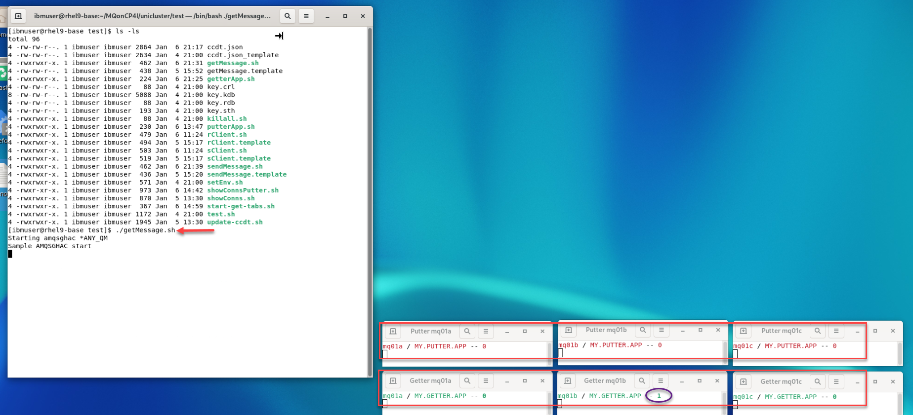 Do a quick test by running ./getMessage.sh You will see one of the Qmgrs getters update. When done do CTL-C