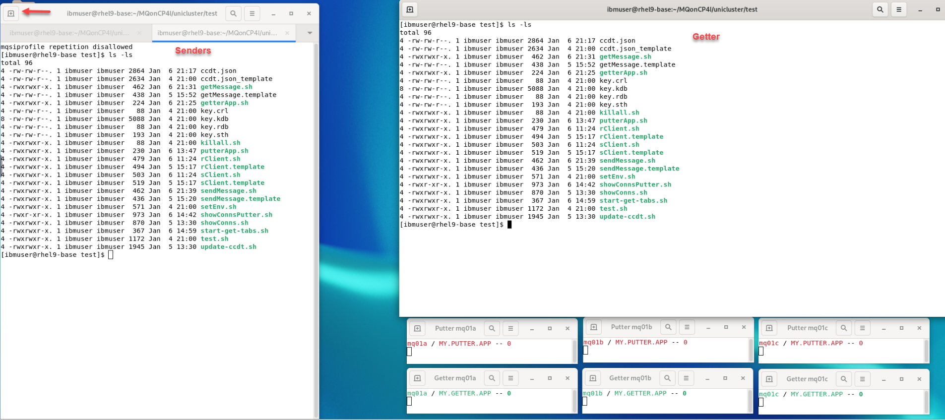 Watch the Getter windows running the GETTER Apps. Eventually, the applications are evenly distributed across the queue managers.