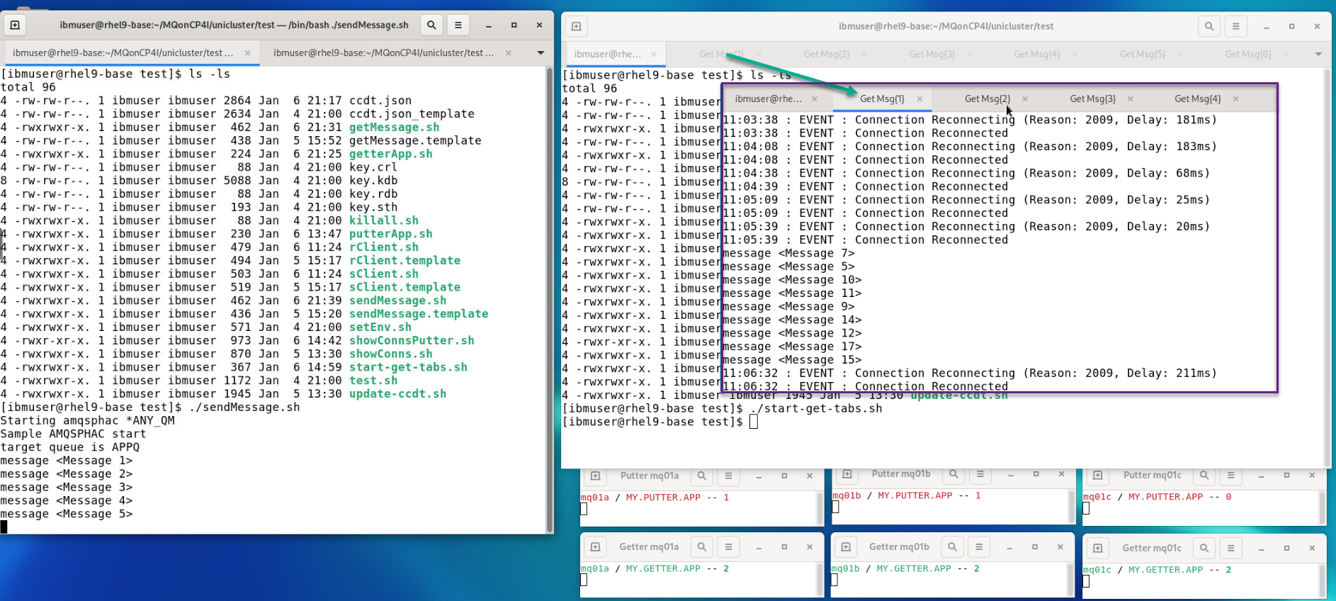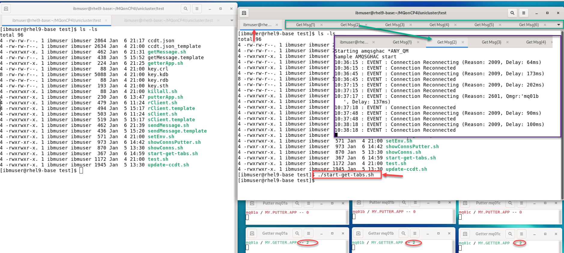 Now from the Getter terminal we will start six new tabs each running a getting application amqsghac using ccdt.json.
